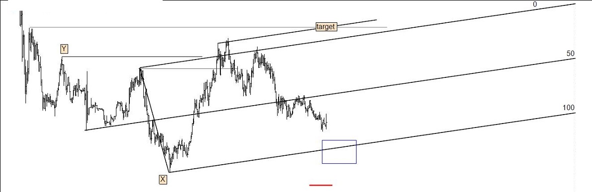 Cotação em ondulação descendente para uma zona onde se espera a formação de uma onda ascendente. Parando a onda aí, uma compra será executada, com stoploss colocada abaixo da onda x e target pelo menos na confluência da onda y.