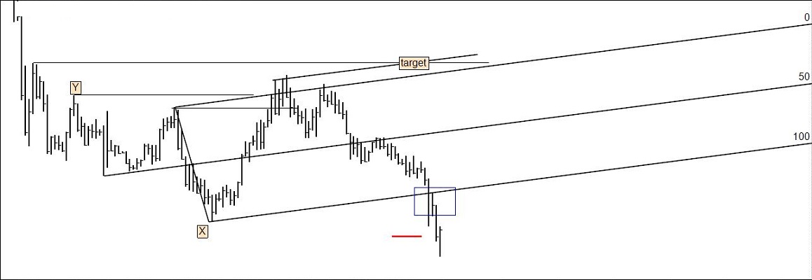Assim de repente, sem desenhar nada e só vendo o intervalo de preços e de tempo que apresentas, poderia aguardar um pullback à ML inferior e nesse momento abrir posição curta. Isto porque as ML quebradas são, muitas vezes, revisitadas pelo preço antes de seguir viagem. O target seria junto à diagonal descendente traçada com base no ponto x e nos mínimos anteriores. O stop ficaria um pouco acima do mínimo relativo anterior, foi uma zona onde o preço se segurou por 3 vezes, mesmo assim, tenho algumas dúvidas em relação a este sítio, mas acima desta zona, o R:R deixa de ser atrativo e não haveria negócio para ninguém.