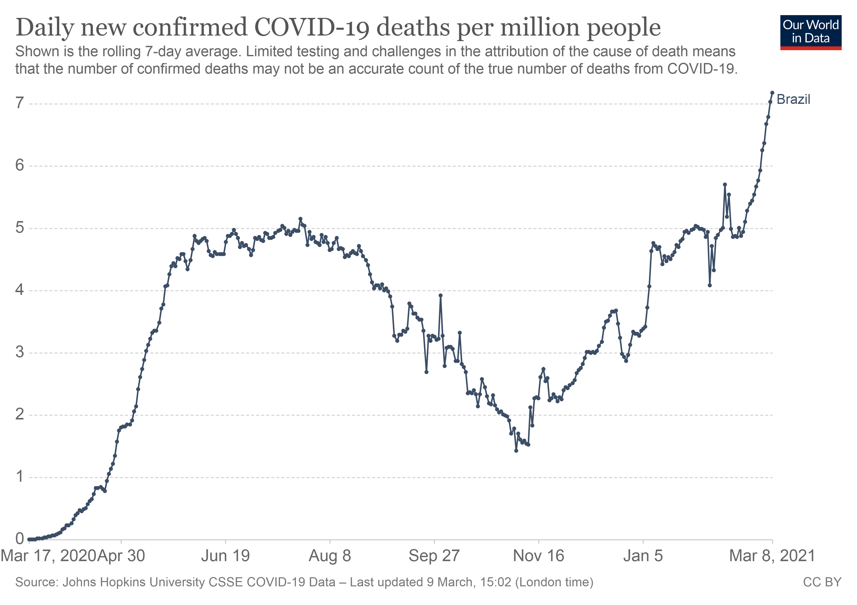 Além de atravessar um forte agravamento da pandemia, o Brasil lida ainda com a nova estirpe detetada no Amazonas (P.1), que já se espalhou pelo território nacional e que, segundo o próprio Ministério da Saúde brasileiro, é pelo menos "três vezes mais contagiosa" do que a original.