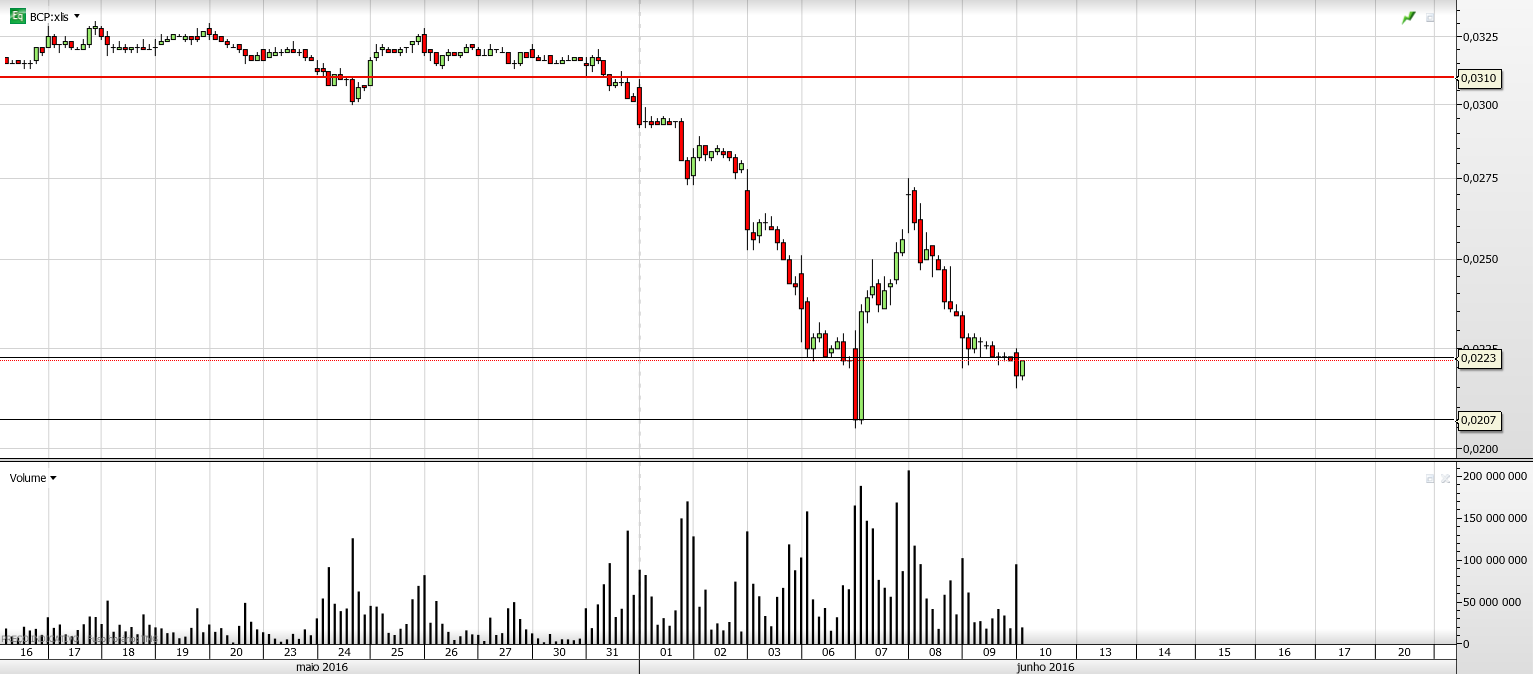 jmatos0808 Escreveu:A cotada está estável, o que traduz um comportamento interessante. Nao acredito que nos próximos dias venha abaixo dos 0,0200€. Aparenta ter voltado a ser uma cotada "normal" que apenas acompanha a queda do PSI20, espero é que não seja por ser feriado. Acredito que estejamos a roçar o fundo, comprei hoje ao melhor quando caia 0,90% mas acabei por comprar a cair 0,45%. Foi ao neutro e voltou a inverter para quedas, mas repito, apenas está a acompanhar o PSI20. Nao me parece que vá acabar o dia a cair acima de 2,5%. Longo nos 0,0224. Va la so preciso de apanhar 1 disparo teu de pelo menos 8% para "estar em casa".