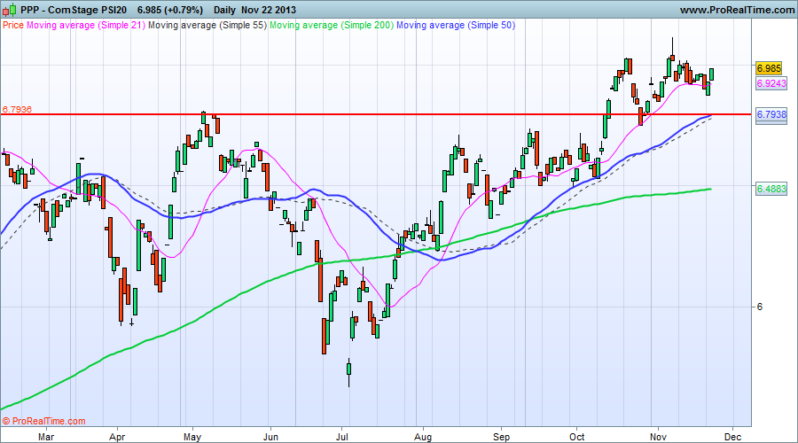 grafico PSI dos ultimos dois anos o indice tem respeitado uma barreira dos 5700 6400 com quebra em baixa em Maio de 2013 mas que encontrou suporte numa provável LTA que se pode vir a formar com o minimo de Agosto de 2012 e segundo toque Agosto de 2013, faltando um terceiro para validar a linha.