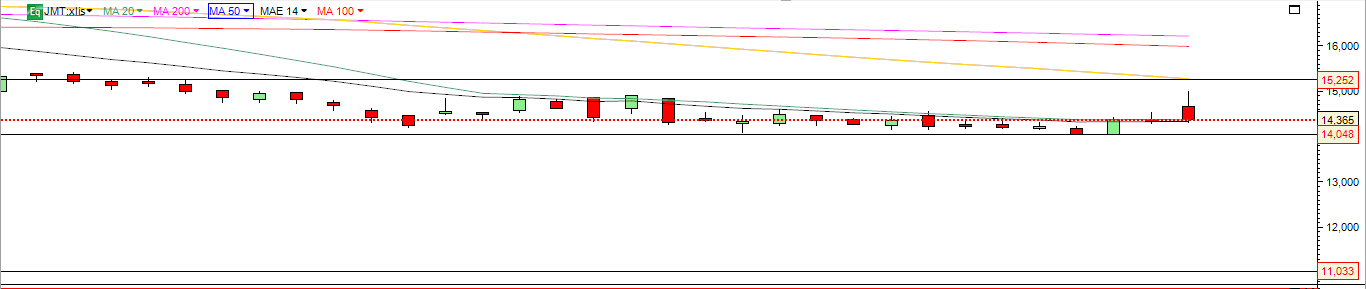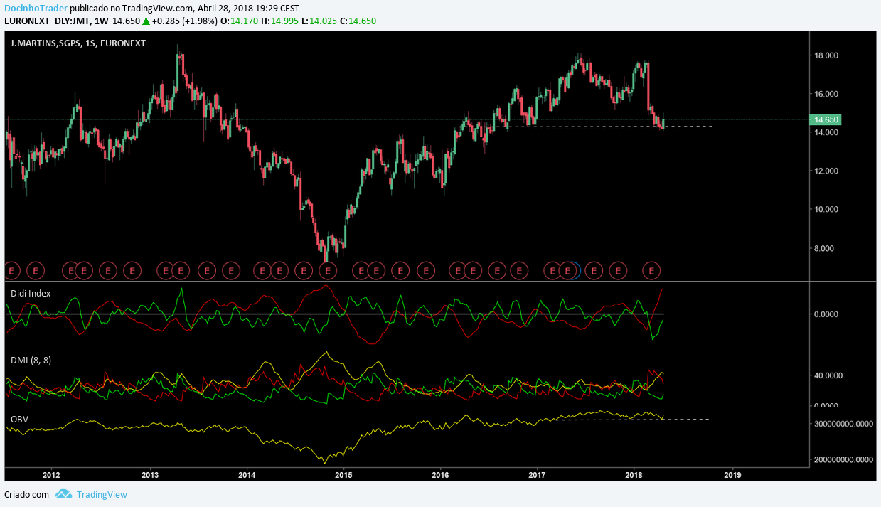 A JMT na minha opinião está numa zona decisiva, fechos abaixo dos 14€ é para sair a correr, no entanto está a aguentar o suporte assim como o OBV, pelo que considero uma boa entrada longa até que as indicaçoes anteriores se mantenham. No ADX deu um respiro na venda perdendo tendencia, será importante ter algum folgo nesta zona