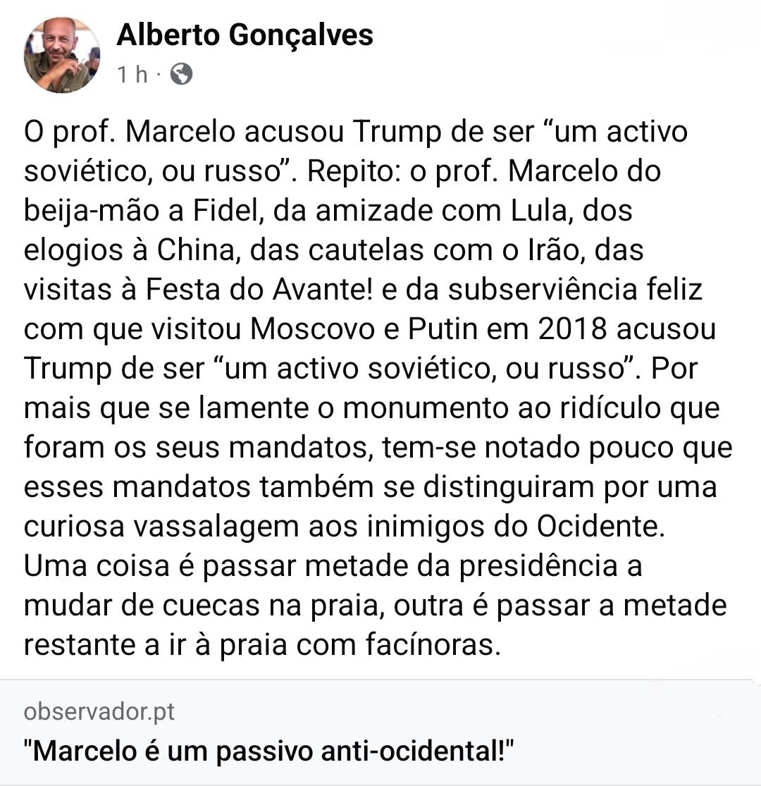 Já tinha escrito algumas vezes sobre isso, e até os norte americanos, segundo sondagens, acham que o Trump tem favorecido a Rússia, mas um chefe de Estado dizê-lo desta forma é pouco comum. Está de parabéns o Marcelo por isso. E até o engano de dizer soviético e depois corrigir rapidamente para russo ficou bem, porque a Rússia continua a usar símbolos soviéticos nos acontecimentos mais importantes.