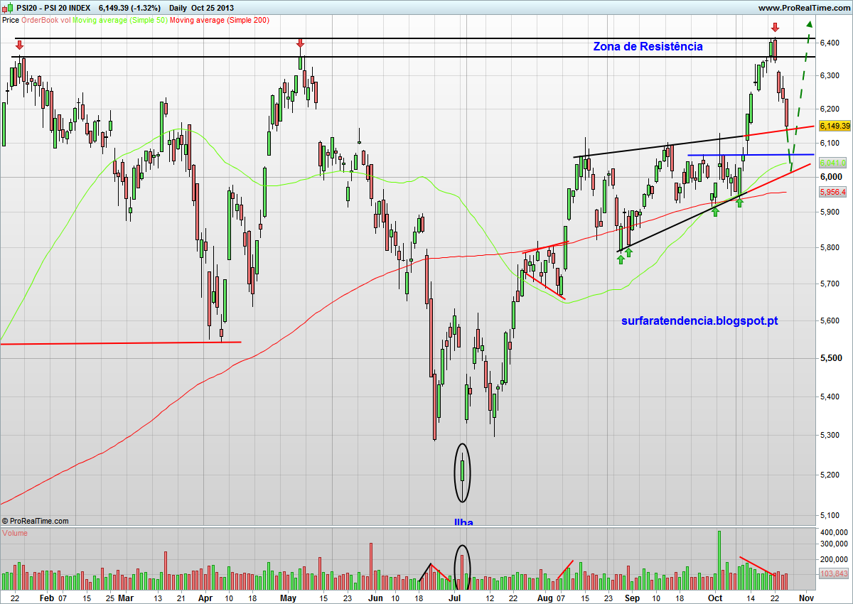 Voltando ao índice, o que poderemos esperar do curto-médio prazo? Depois de nove velas verdes, algo que já não era visto há vários anos, a actual correcção tem tanto de normal como de salutar. Não era expectável que a resistência quebrasse em definitivo à primeira tentativa... O mesmo já não se espera de uma segunda tentativa, que poderá chegar em breve. A consolidação triangular que esteve na origem do ataque à resistência deverá agora servir de suporte à correcção, relançando novo ataque ascendente. Por definição o vértice das consolidações triangulares serve normalmente de suporte/resistência, devido ao congestionamento que geralmente existe nessas zonas. Assim, acredito que o padrão impeça maiores quedas, sendo provável que a inversão se dê antes dos 6000 pontos.