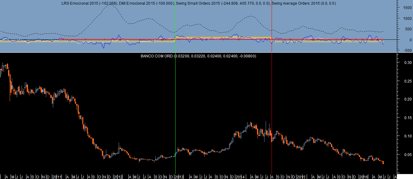 Tudo depende da ocorrência do clima emocional dado pela linha branca na zona dos indicadores, se essa linha atinge e ultrapassa o valor de +100 o clima é favorável para comprar mas quando atinge os -100 o melhor é fugir do mercado, ou seja, vender.