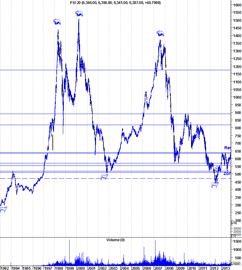 Em ambas as tentativas o primeiro topo tem sempre mais volume que o segundo, mas agora reparemos no ano 2013, novamente o duplo topo ( Jan. / Maio), repetindo-se a historia do volume mas agora em Outubro quebramos a já referida LTD semanal, com uma nova vaga de volume e estamos a testar novamente o duplo topo que ocorreu em Jan. e Maio.