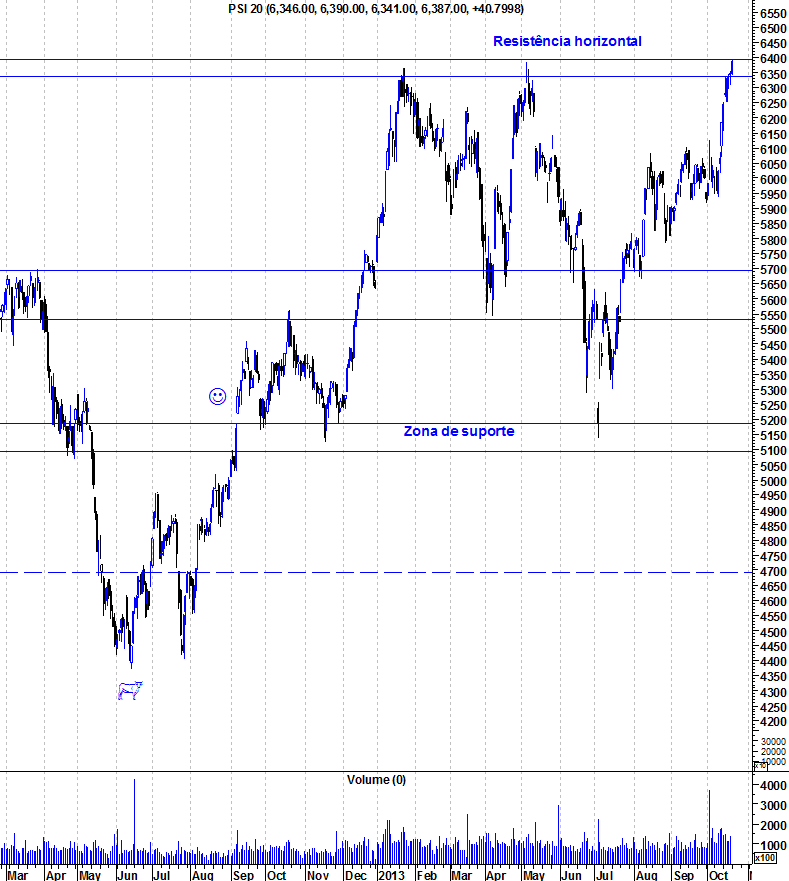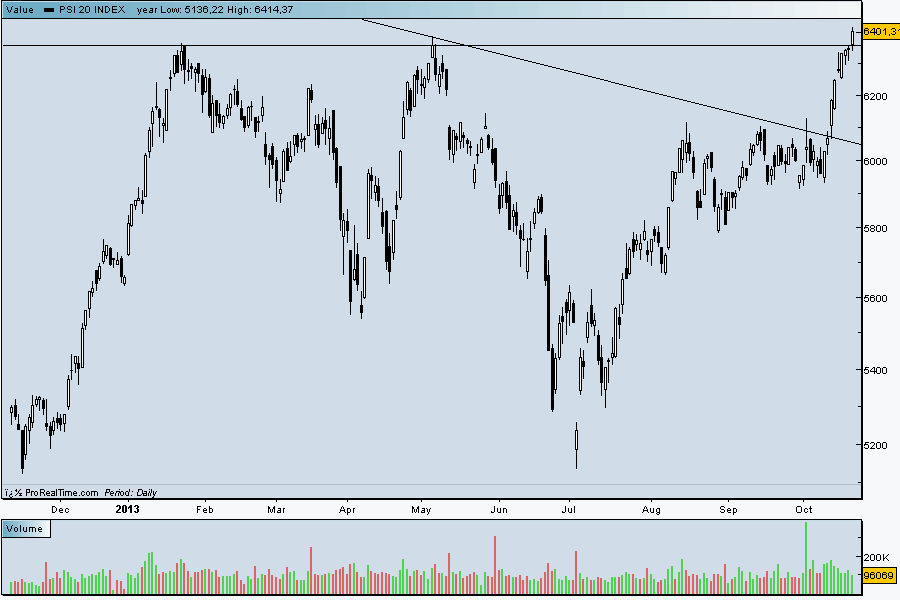 "Deixo um update gráfico ao PSI-20. A forte resistência dos 6350 pontos foi quebrada em alta, afastando o cenário de triplo topo! Com a sessão de hoje, são já nove as sessões consecutivas de subidas, um registo que já não se verificava há alguns anos. Não querendo entrar em muitos detalhes, já que o PSI-20 está a votos na sondagem semanal (e tudo indica que irá vencer), acredito que este breakout com volume fraco e descendente poderá não resistir, esperando-se uma correcção até à zona dos 6000 pontos.