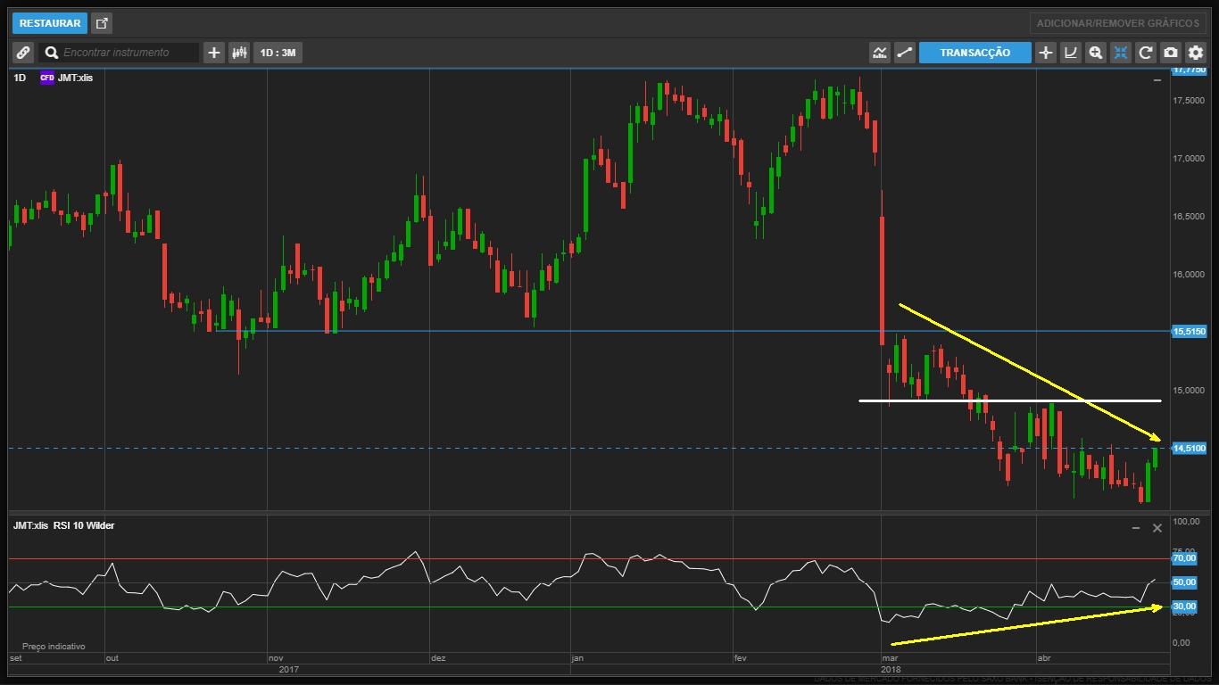 . há espaço para cair ate ao suporte identificado no semanal (já que a tendência descendente não inverteu e o RSI encontra-se acima dos 50);