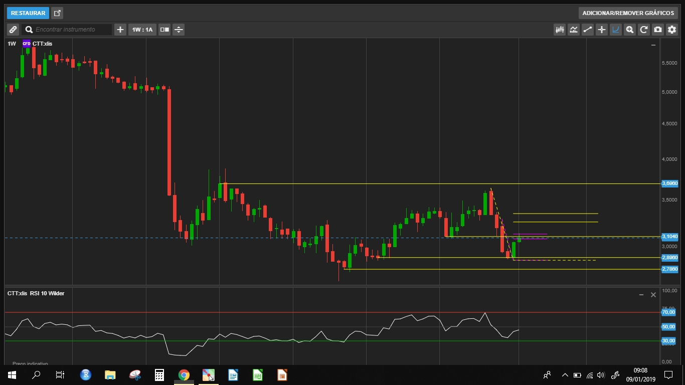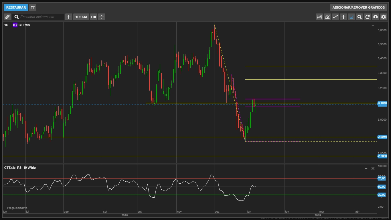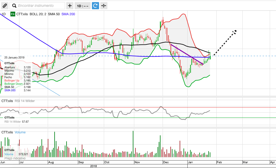 com o PSI a bater na forte resistência 5000-5050 , com um bom inicio de ano , a beneficiar do efeito inicio janeiro , os CTT não conseguem sair da zona dos 3 euros . a cotada esteve em tendência ascendente durante 6 meses entre 3 euros e 3.50 euros , não pelos fundamentais que são ainda maus , mas pelo fecho constante de curtos que diminuíram a posição em cerca de 7% do capital social dos 10% na altura para atuais 3% . agora que posição curtos ficou estática , esteve em queda desde dezembro e não existem subidas neste momento .
