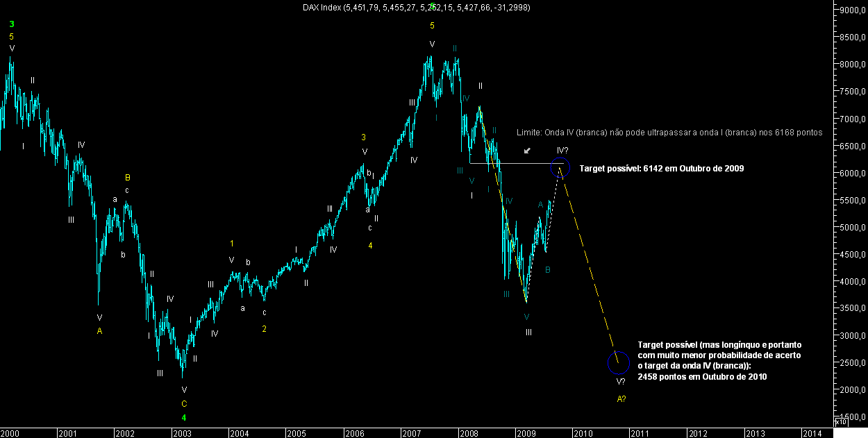 Já agora, por curiosidade dos que acompanham com algum interesse os estudos de EW, deixo ficar a "minha" maneira de ver o mercado à data actual, com a contagem das ondas Elliott adaptadas ao índice alemão DAX-30 para a "big picture".
