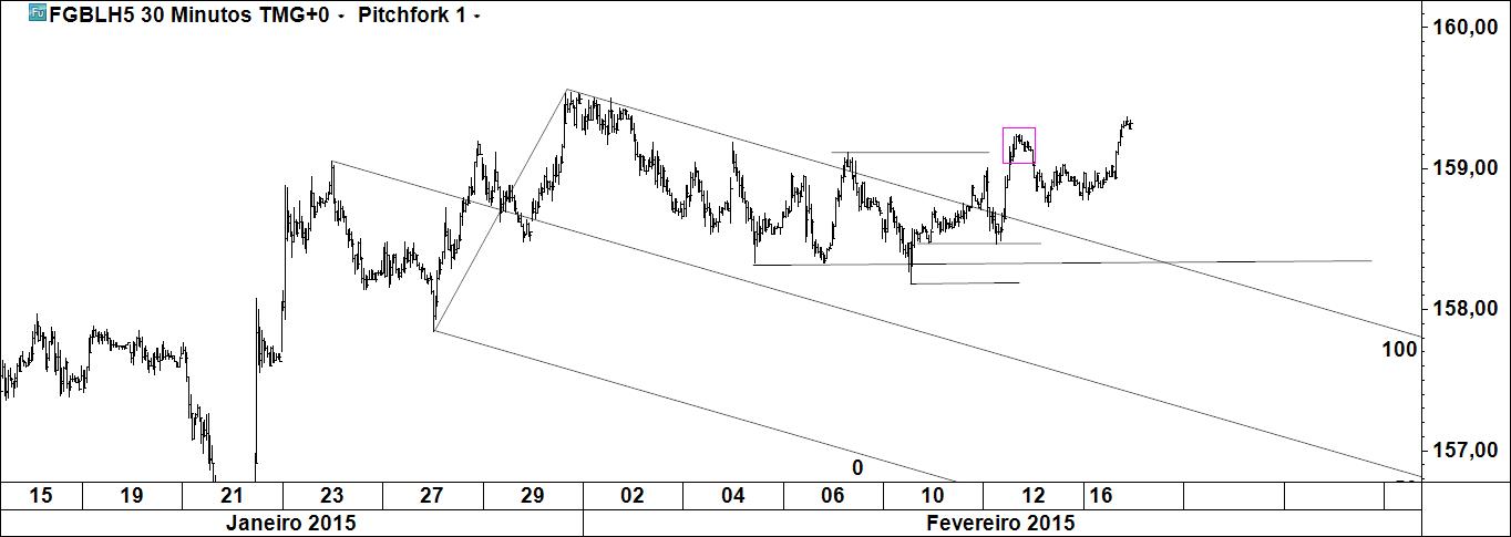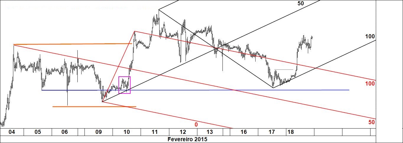 Gráfico 1: ordem de venda colocada além do b/e executada, negócio encerrado. Faz parte do plano uma compra onde se tinha o target final, situação em revisão uma vez que o preço tem mostrado pouca vontade em visitar a zona.