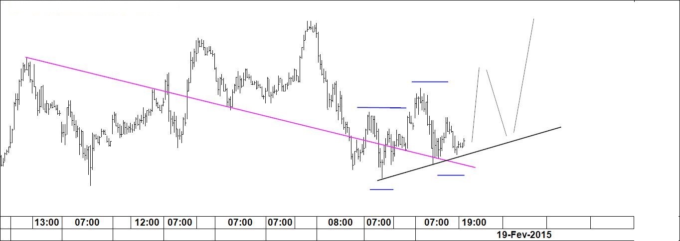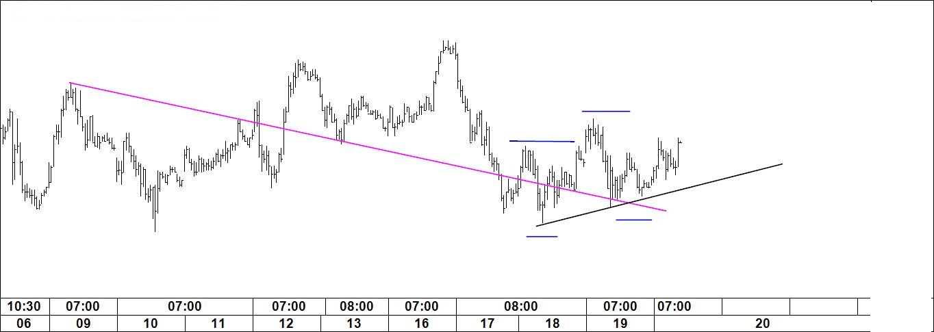 O gráfico 2 destina-se a fazer o acompanhamento do padrão "V na linha". Também se aproxima a hora da verdade. Pode aguardar-se que o preço se digne fazer o movimento desenhado. Neste padrão a técnica nada tem de complicado: vende-se o topo e compra-se a base. O inverso deve ser feito quando se estiver perante o "V invertido na linha".