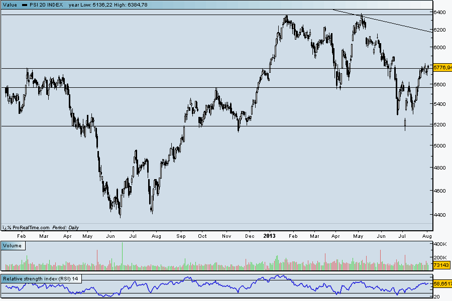 O PSI20 no dia 30 de julho quase que atingia o limite máximo do intervalo correspondente ao primeiro alvo (58227 - 5784,3), fechando a semana ligeiramente abaixo desse intervalo.