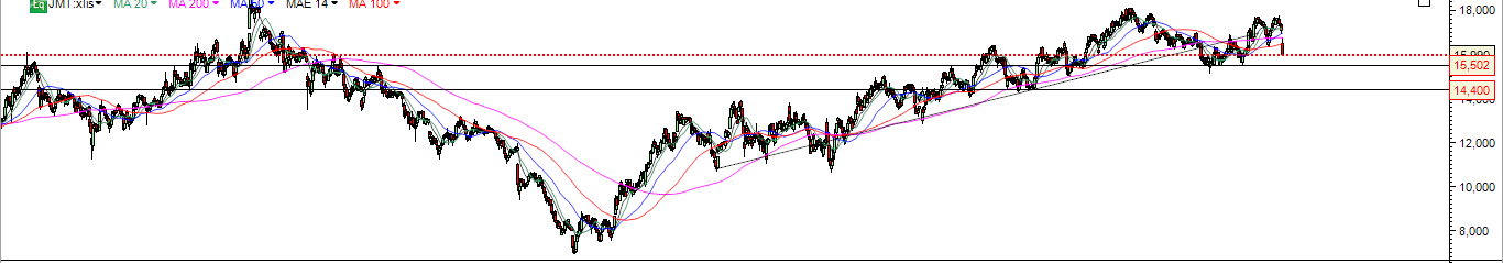 A acção dá o primeiro grande sinal de fraqueza e, por isso, estive Bullish desde a zona dos 11 euros, em Março de 2015 e com este primeiro grande sinal de fraqueza, dispo o meu fato de touro. Como bem referes, sou incapaz de dizer que a JM está bearish, mas é a hora de deixar de estar bullish no Bull Market mais antigo da Bolsa portuguesa.