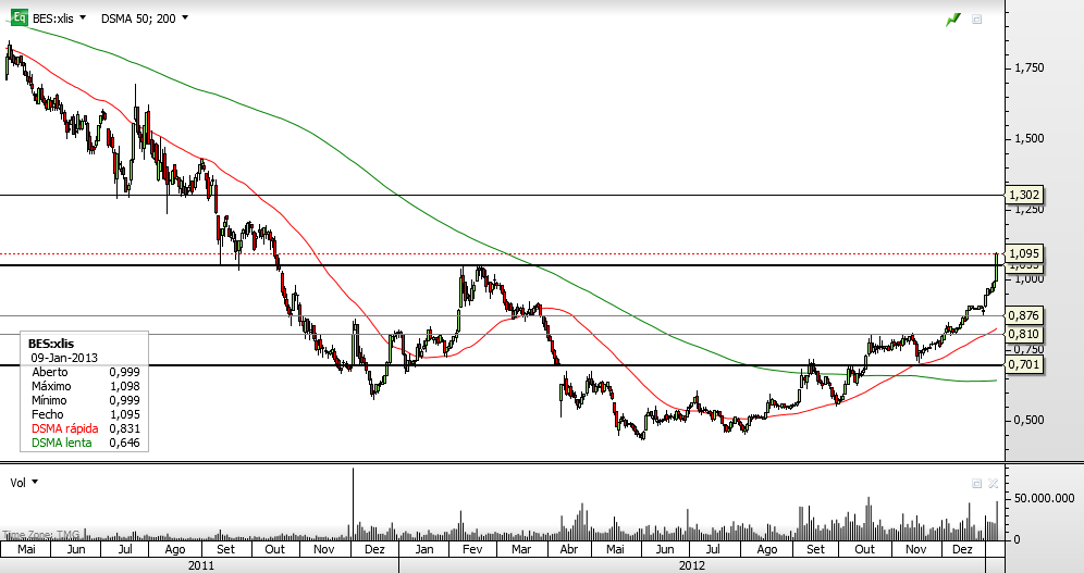O BES é a outra acção que sigo, enquanto não passar os 0,60 (que parece-me ser um antigo suporte e agora poderá ser uma resistência), é ficar de fora.