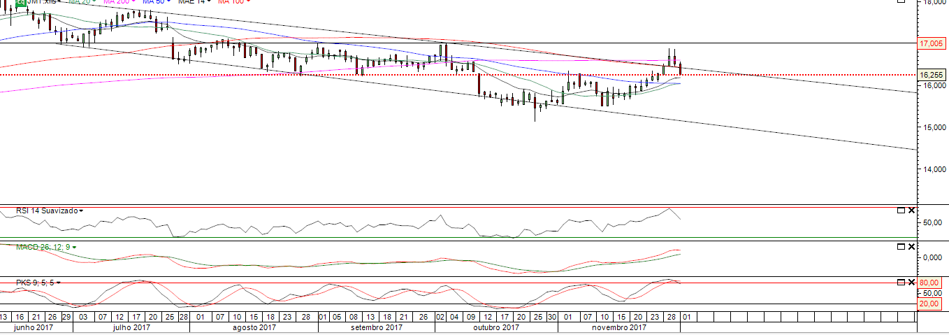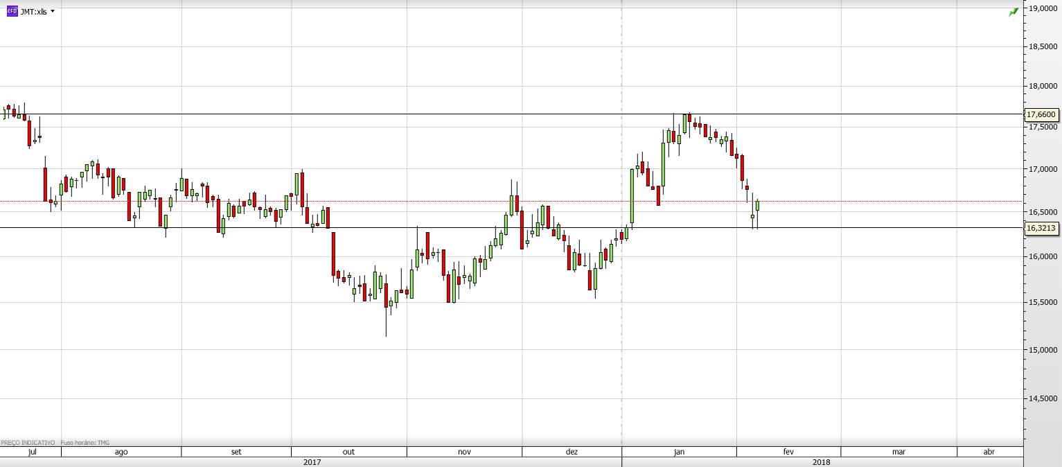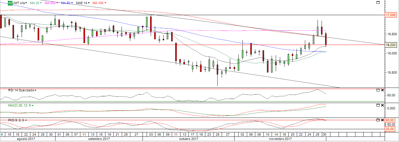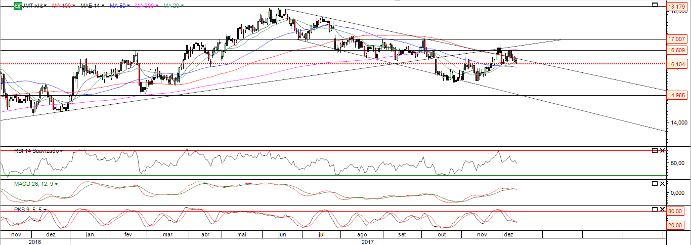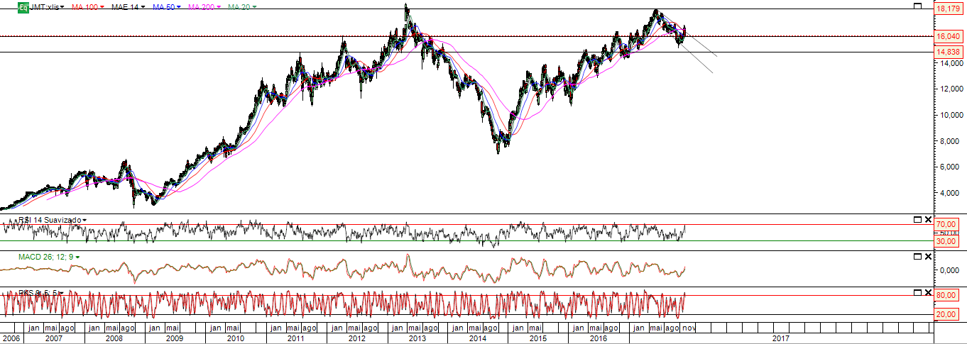 Se escolhesse um prazo mais curto ou mais longo, a JMT estaria num canal ascendente. Há que elogiar este jogo de cintura para encontrar precisamente o período temporal em que o título se encontra em tendência decrescente.