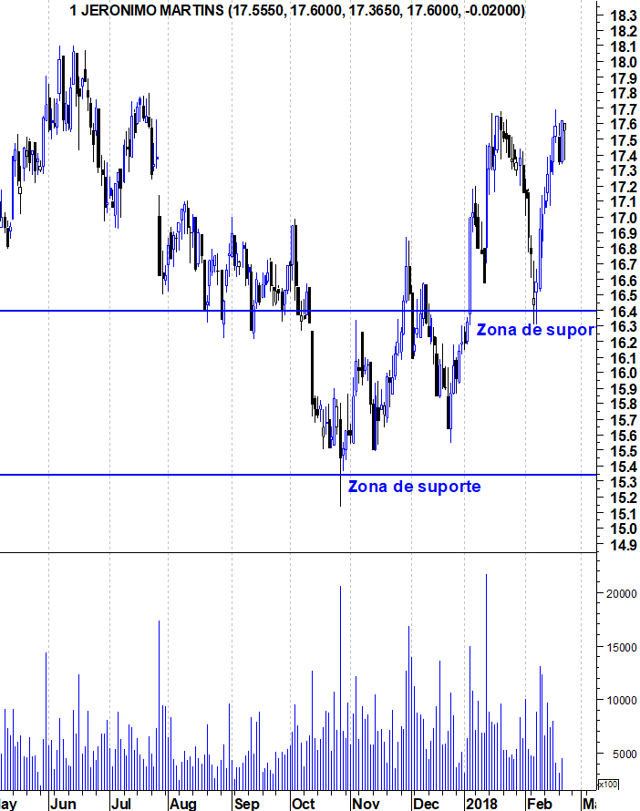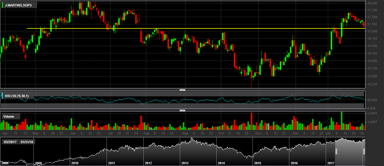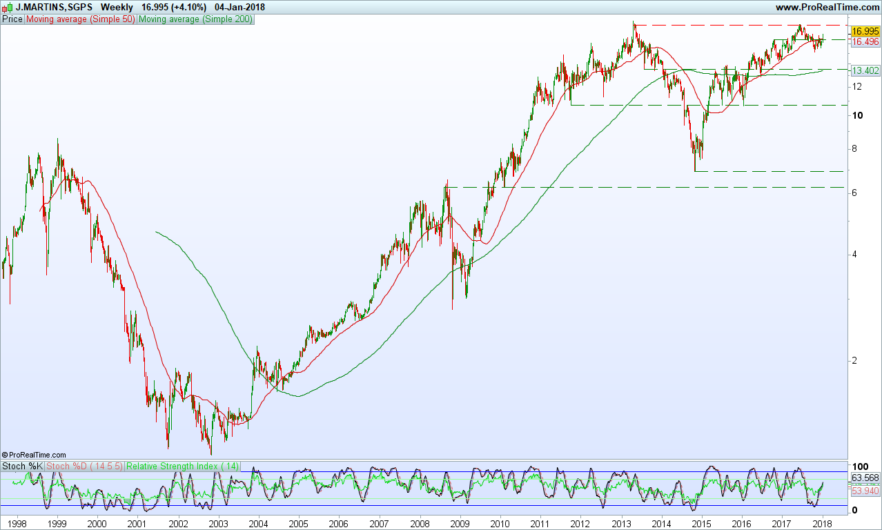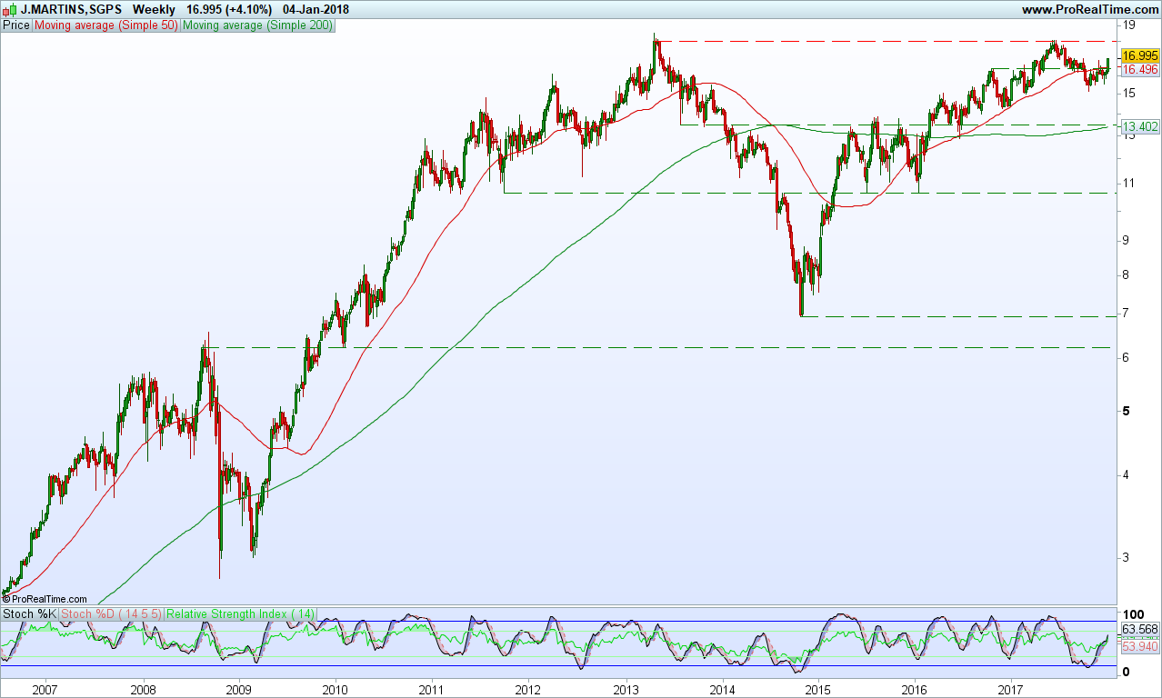 Desde os máximos do Verão passado a Jerónimo Martins apresentou quedas de mais de 15%, tendo inclusivamente quebrado o suporte importante nos 16,39€... A recuperação destas ultimas semanas e a recuperação deste suporte, fez a acção estar a apenas 6,5% dos máximos de 2017 e cerca de 9% dos máximos absolutos. Na zona de fecho de hoje, encontramos uma pequena resistência, que, ao ser superada, levará a JMT para junto da zona de resistência (18,10-18,30€). Desde os mínimos de 2014, a acção já valorizou cerca de 160%. A superação da resistência na zona dos 18,10€, fará a Jerónimo Martins "navegar por mares nunca dantes navegados", activando uma Cup and Handle com uma projecção bastante aliciante para navegarmos com ela ao longo dos próximos anos. Ficam os gráficos...