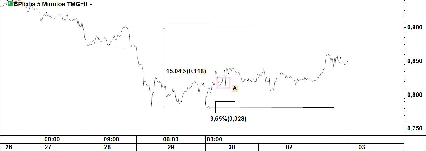Activo: BPI, Timeframe: 5 minutos. Propósito: especular num gráfico de 5 minutos usando a linha como modo de descrever o preço. Resultado: o mercado não nos deixou entrar no lugar assinalado e encaminha-se para o target, deste modo extinguindo a oportunidade em aberto (aquando da feitura do plano o preço estava em A).