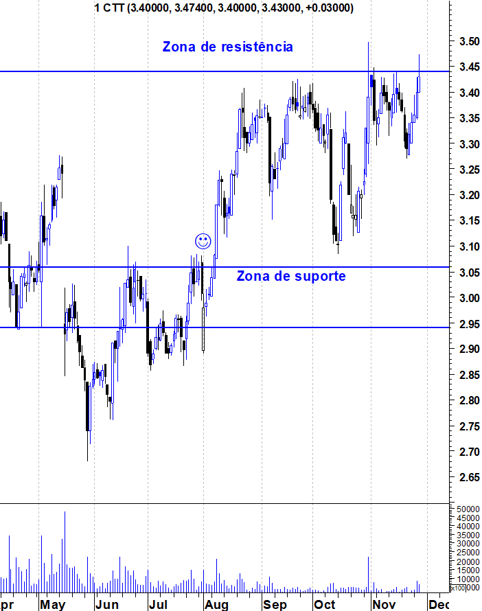 A quebra da resistência entre os 3,44 ao 3,49 euros será o sinal que me fará vestir o fato de touro nos CTT. Esta é uma zona bastante importante pois funcionou como resistência em Fevereiro, Agosto e Setembro deste ano, impedindo que os ressaltos na acção fossem mais do que isso. Se o título conseguir quebrar esta resistência voltarei a assumir um dos lados da barricada, neste caso juntando-me ao clã dos touros. Mas, se o suporte da zona dos 2.94 for de novo quebrado, não tenho qualquer problema em voltar a andar de braço dado com os ursos.