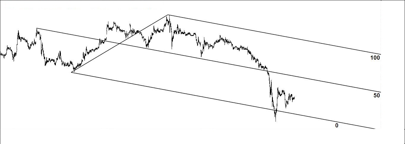 2º gráfico: oportunidade especulativa construída com base no desenvolvimento de uma das regras (sua verificação ou falha) e no contexto do mercado em causa: Frequently, after crossing a lower MLH, prices continue to rise along the MLH before the further drop that was signaled by passing through. So here you can use a sliding parallel through the bottom of the range of the most recent day as a sell signal if prices drop through that SH.