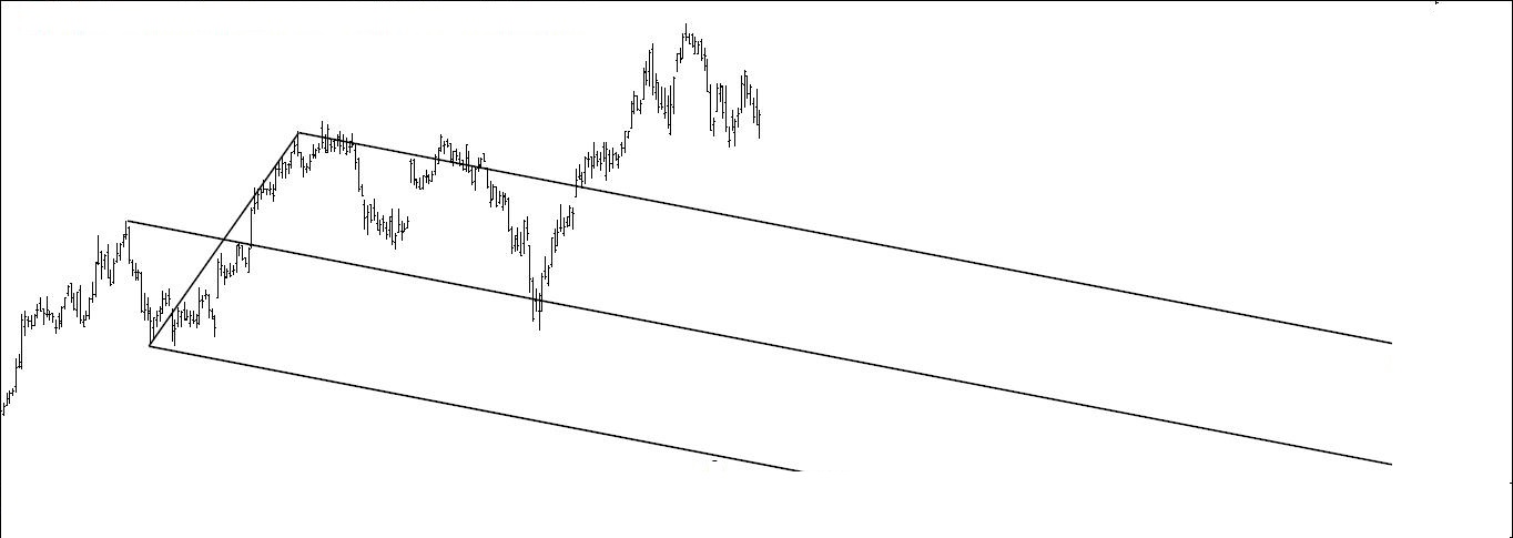 O Alquimista Escreveu:2º gráfico: oportunidade especulativa construída com base no desenvolvimento de uma das regras (sua verificação ou falha) e no contexto do mercado em causa: Frequently, after crossing a lower MLH, prices continue to rise along the MLH before the further drop that was signaled by passing through. So here you can use a sliding parallel through the bottom of the range of the most recent day as a sell signal if prices drop through that SH.