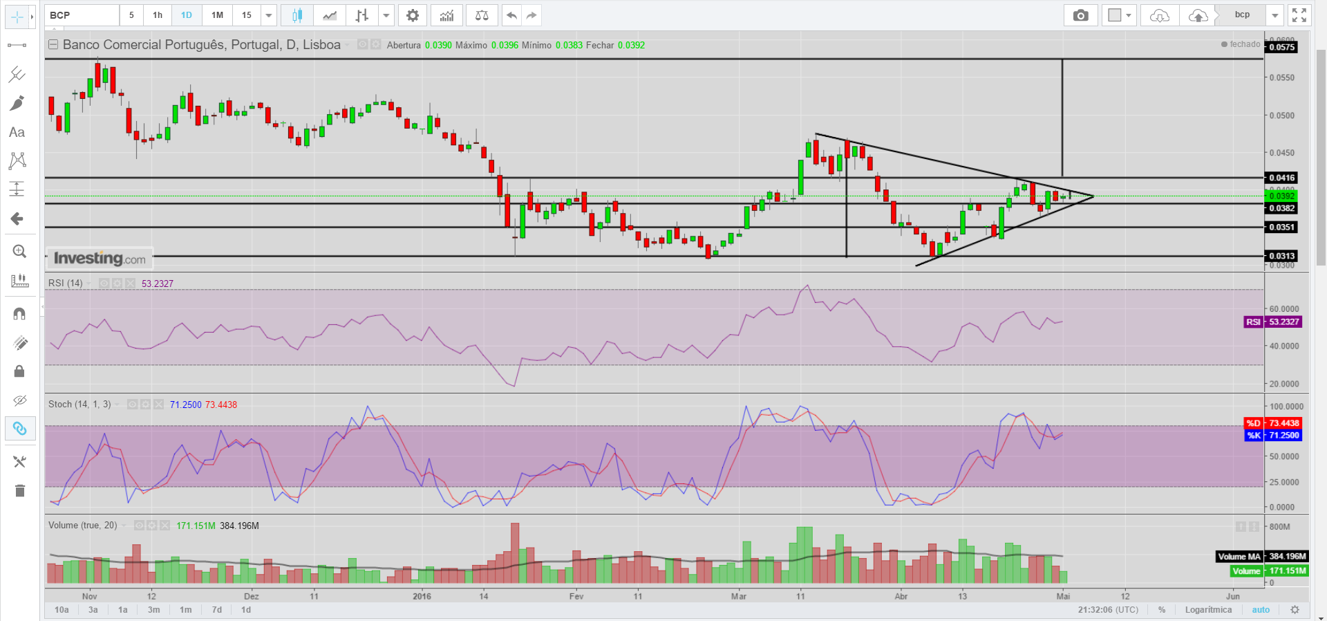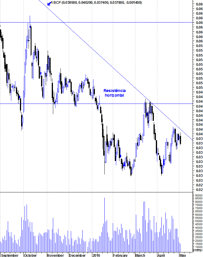 O BCP precisa de dar dois sinais para que eu mude o meu pessimismo: Ruptura da linha de tendência descendente e, sobretudo, ruptura consistente da resistência horizontal na zona dos 0,046.