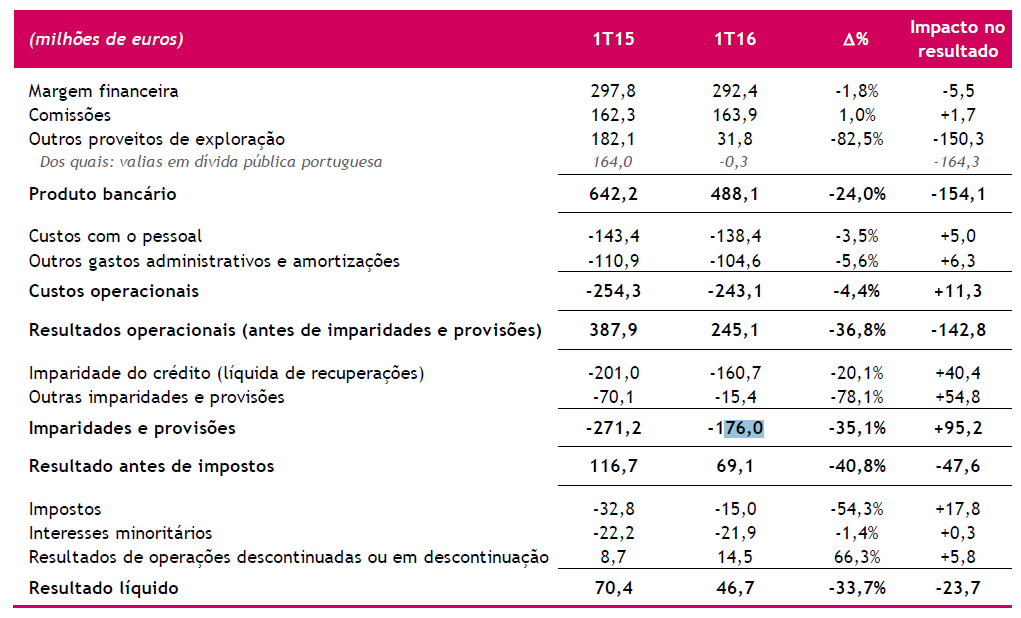 No início de 2015, o Banco Comercial Português apresentou um resultado líquido positivo, ajudado sobretudo pela venda de dívida pública portuguesa (um aspecto que, durante a crise, possibilitou ganhos aos bancos). Um ano depois, o primeiro trimestre de 2016 não foi tão rico nos resultados em operações financeiras, o que deverá pesar nos lucros do banco de Nuno Amado.