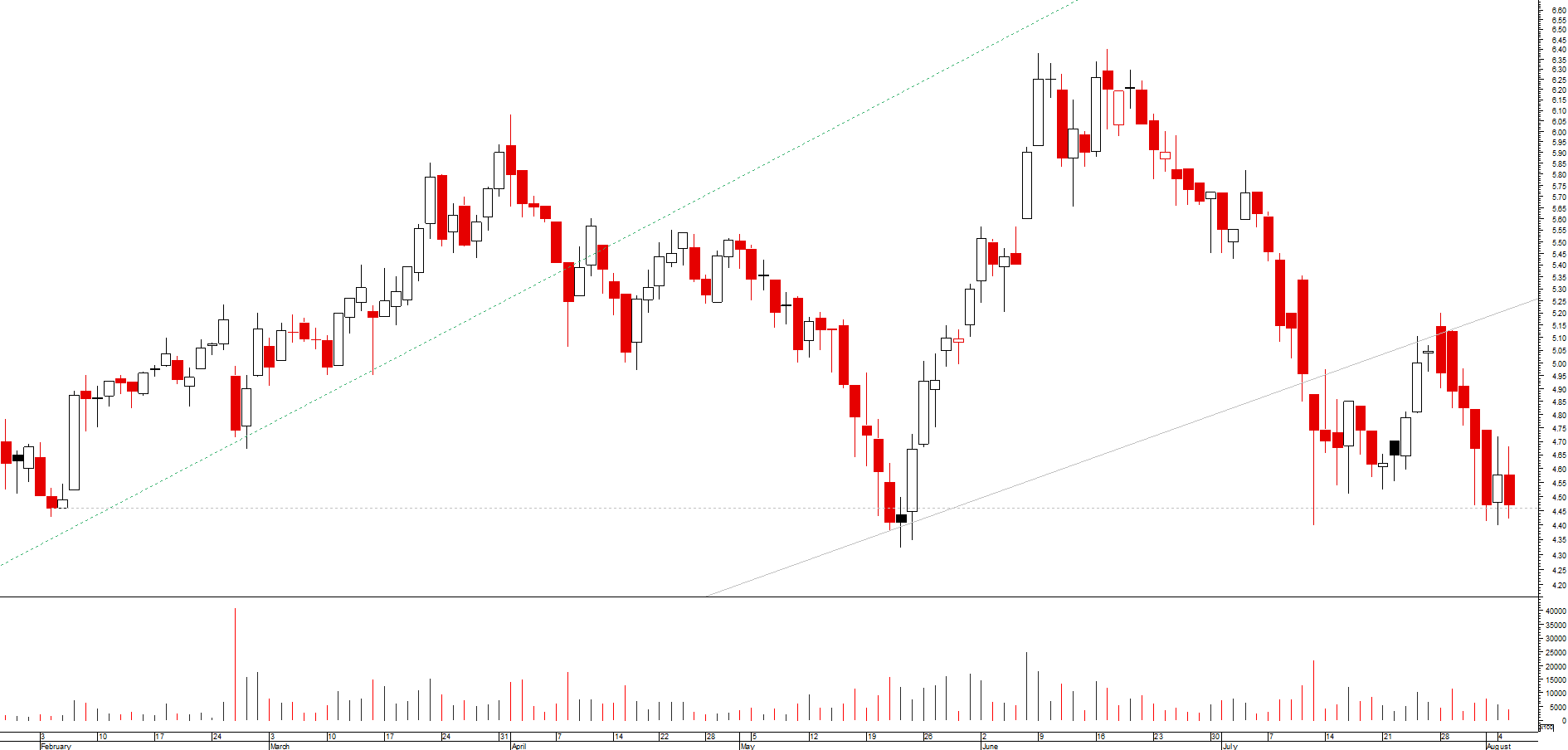 Ontem pensei que ia recomeçar as subidas, mas ao longo do dia perdeu a força e hoje voltou praticamente ao suporte no casa dos 4.4x- 4.5x...