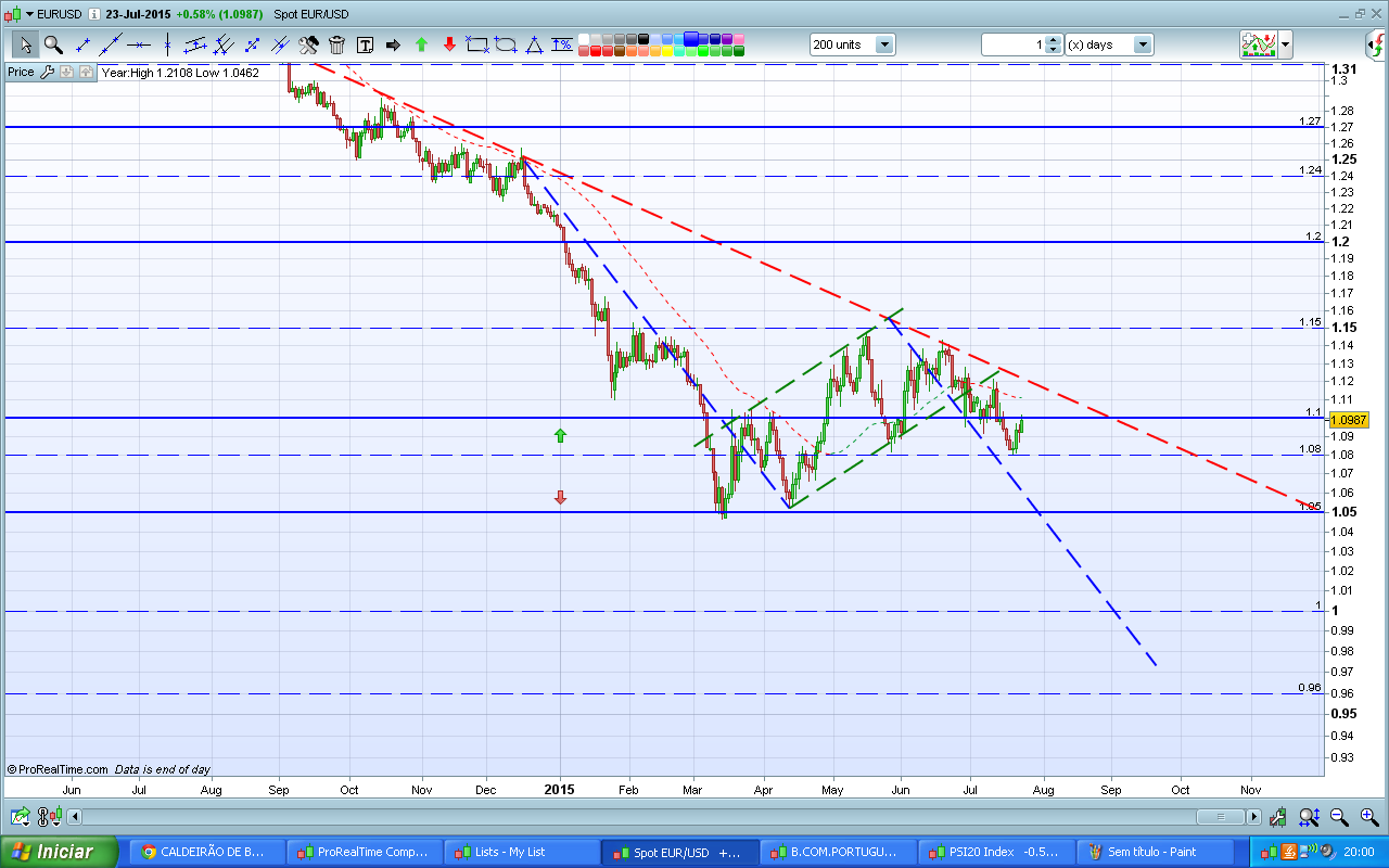 No curto prazo parece querer furar os 1,10 com caminho aberto ate aos 1,12 e parece estar a criar um suporte no actual valor(1,098) zona que serviu de resistencia anteriormente.A ultima vela desenhada no mensal esta a indicar inversao,embora ainda nao tenhamos concluido o mes,mas ja falta muito pouco e a maior parte dela ja esta feita,medias e trix a inverterem no semanal.A bandeira de facto esta la mas so irei acreditar nela apos o rompimento dos 1,08,ate la estou mais otimista,acredito para ja na lateralidade e melhor ficarei se quebrar em alta os 1,12,vamos aguardando.Bom fim de semana a todos