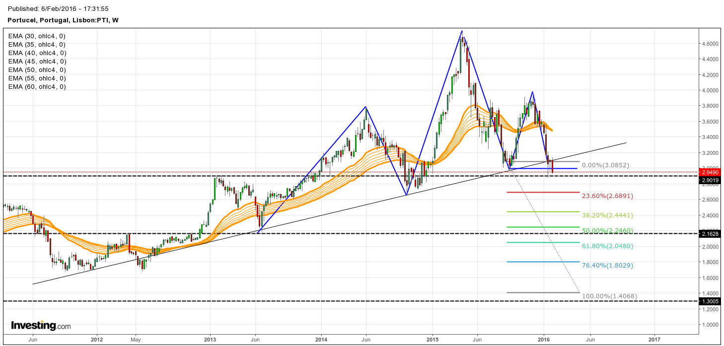 No gráfico semanal, o grupo de EMA's encontram-se bastante comprimido e o EMA 30 está prestes a cruzar of EMA-60 semanal. Ainda no gráfico semanal, a cotação confirmou a formação de um "bearish Head & Shoulders", fechando por baixo dos 2.9860 euros. Atendendo à geometria deste padrão, a cotação poderá atingir a zona dos 1.40 euros.