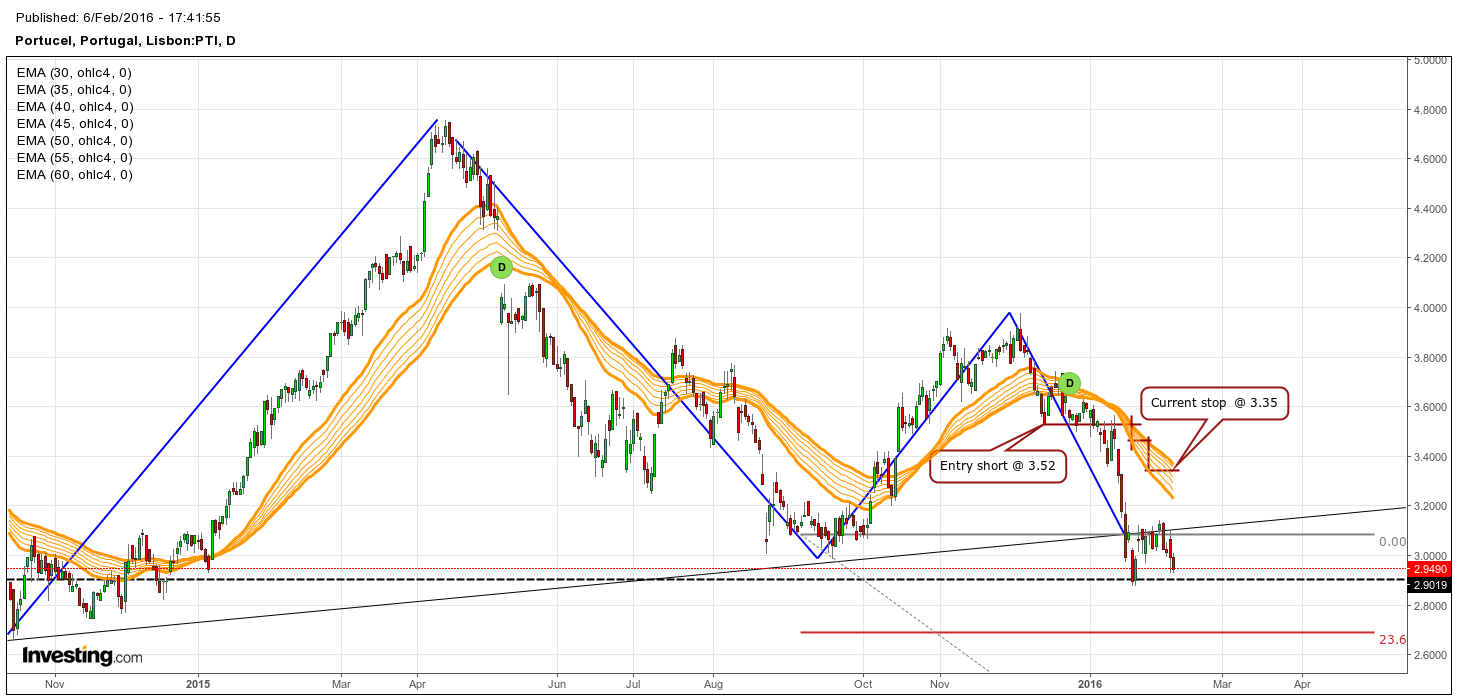 No gráfico diário o grupo de EMA's encontra-se em expansão e voltados no sentido descendente, ao qual se junta a pressão do "Head & Shoulders" formado e confirmado no gráfico semanal. Sendo assim, existe uma grande probabilidade desta cotada continuar a caminhar para mais desvalorizações. Entrei short nos 3.52 euros e o meu stop encontra-se actualmente nos 3.35 euros. A cotação alvo será os 1.4 euros, que é a distancia projectada do padrão formado.