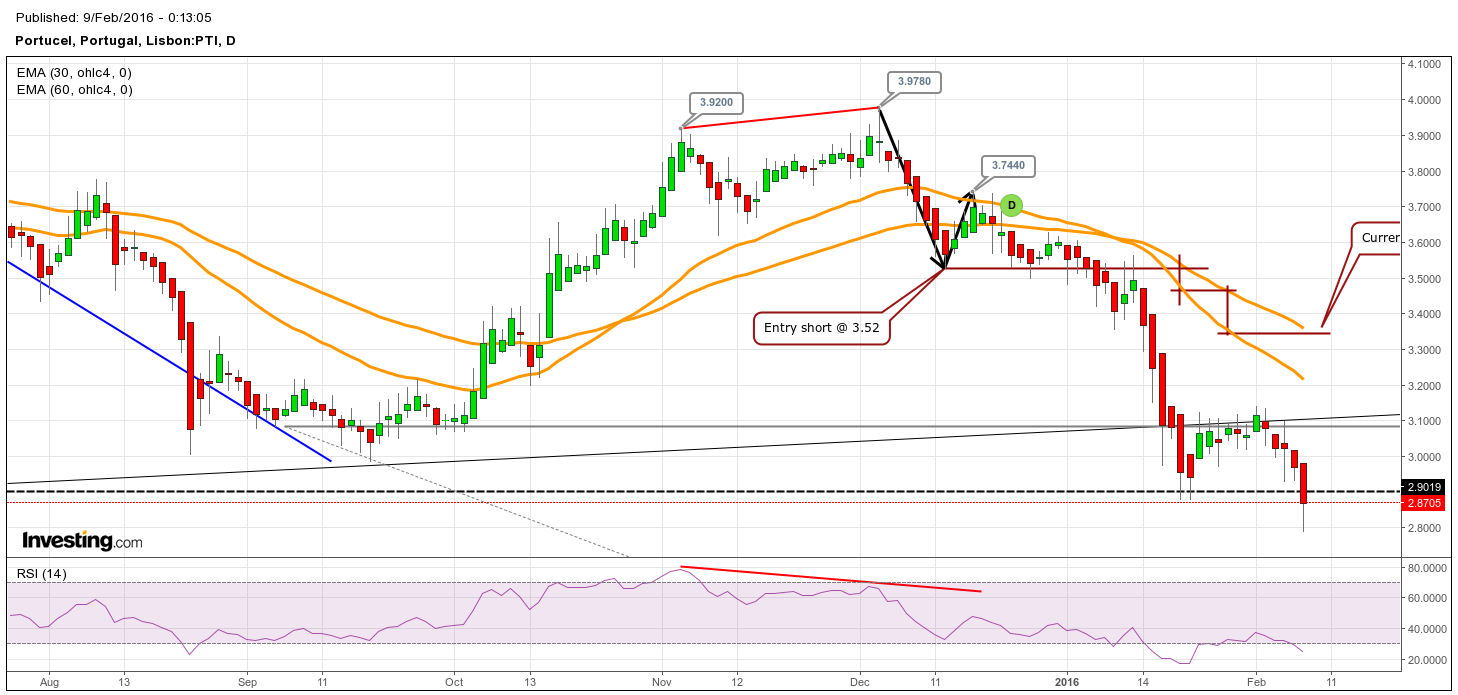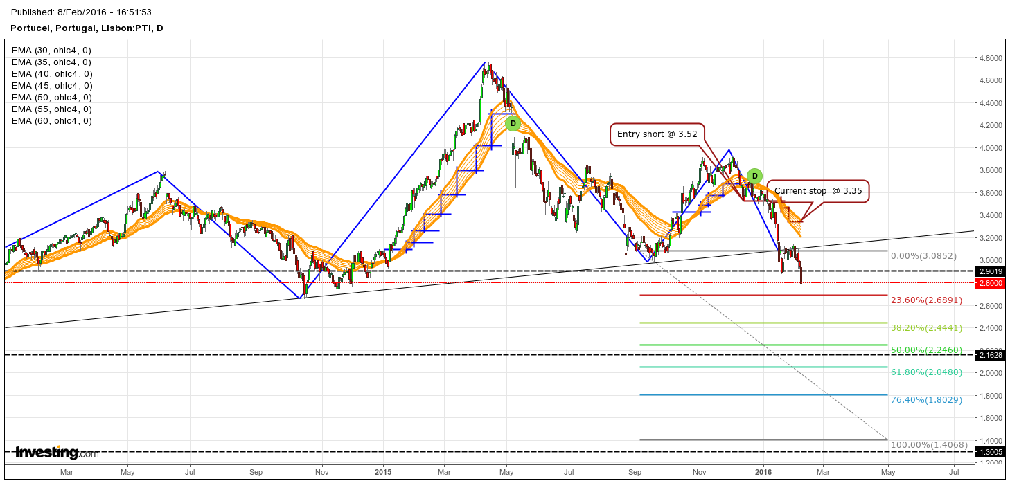 Mais uma desvalorização de ~5% na Portucel. A cotação está quase a percorrer 23.60% da distancia prevista do padrão "Head & Shoulders". Posição "short" com o stop inalterado nos 3.35 euros. A trajectória descendente poderá sofrer um abrandamento na zona dos 2.4-2.6 euros, correspondendo à área do mínimo dos finais de de Outubro de 2015 e posteriormente na zona dos 2-2.0, correspondendo a 50% da distancia prevista pelo padrão e numa zona de suporte/resistência de longa data. Vamos lá ver o que acontece!