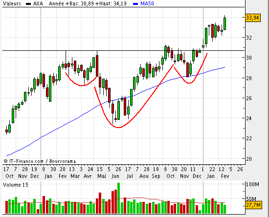 Para quem acompanha o mercado francês gostaria de chamar a atenção para a interessante situação técnica da AXA. A acção encontra-se em máximos de 6 anos e rompeu esta manhã a resistência dos 33,40 com volume muito forte (ajudada pelos bons resultados). Note-se que a ruptura foi feita em gap up.