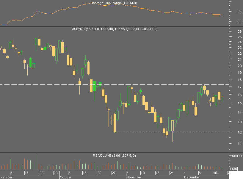 A AXA tem-se mantido no intervalo já mencionado (12-17) mas ultimamente anda mais interessada em namorar a resistência. Esta manhã até se passeia ligeiramente acima dos 17.