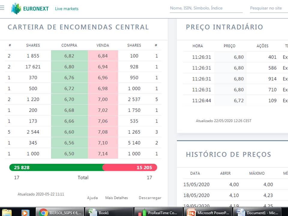 Estava a observar o preço intradiário e reparei que tinha um numero muito alto para compra a 6.80€. Pensei para mim seria dificil baixar desse valor brevemente. Mas foi feita uma transação a 6.72€ sem terem sido limpas as que estavam nos 6.80€ e 6.76€.