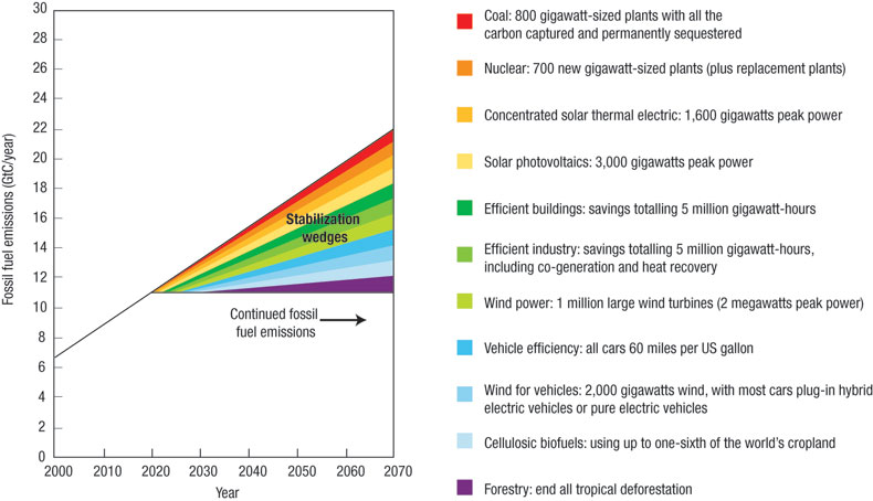 Já tem uns anos, mas esta teoria defende que com apenas 8 destas estratégias se seria capaz de equilibrar as concentrações de GHG. Em 2005, quando a teoria foi proposta, já haviam sido identificadas 15 possíveis estratégias destas ("cunhas"). Bastantes delas são bastante sensatas, pacíficas e até baratas/rentáveis.
