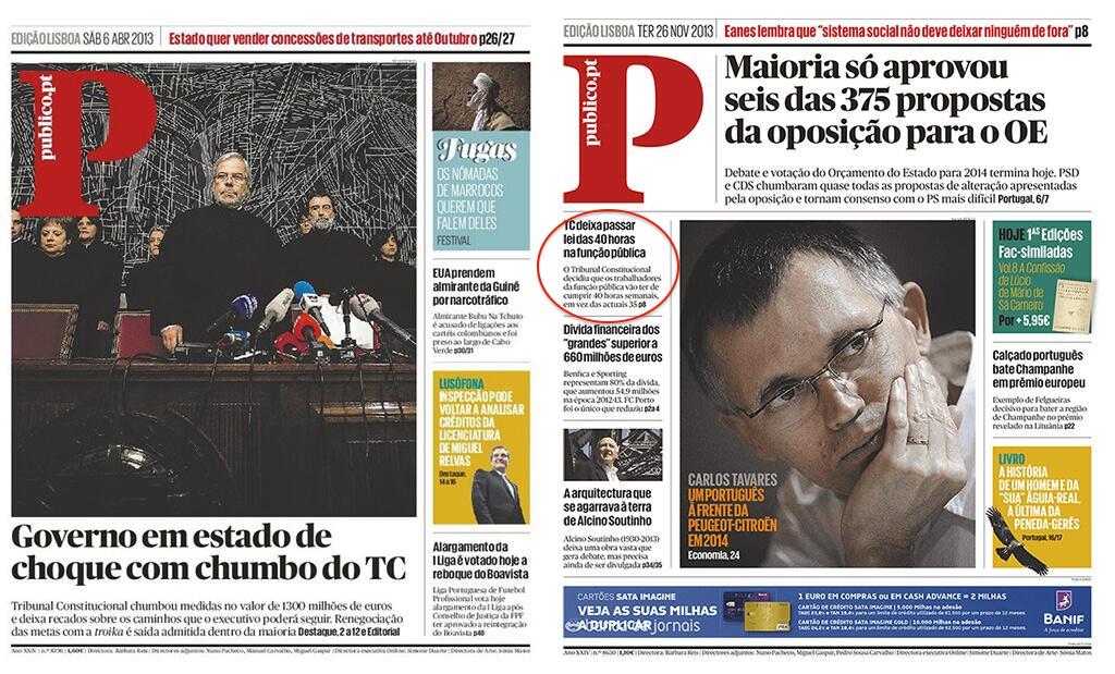 Em Portugal, um corte de entre 3,5% e 10% começou logo a ser aplicado a partir de 2011 para os salários acima dos 1500 euros mensais. Em 2012, o Governo decidiu não pagar os subsídios de férias e de Natal também para os funcionários com um rendimento acima de determinado valor, o que representou na prática um corte de 14% da remuneração anual. Em 2013, o Orçamento previa a devolução do subsídio de Natal, mas o Tribunal Constitucional acabou por forçar a devolução dos dois subsídios. Para o próximo ano, o executivo optou por quase duplicar os cortes salariais que já estavam em vigor. Passam agora a aplicar-se a partir dos 675 euros mensais e vão de 2,5% até 12%. O Governo tentou avançar para despedimentos, mas encontrou mais uma vez a oposição do Tribunal Constitucional.