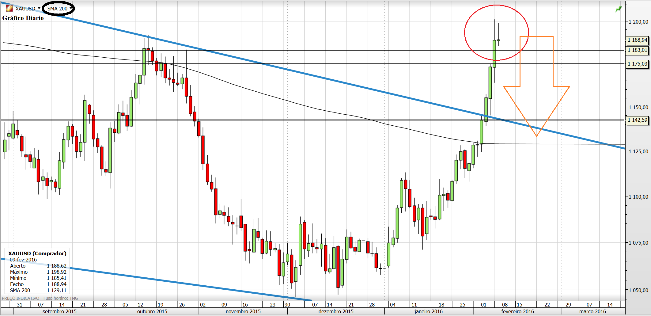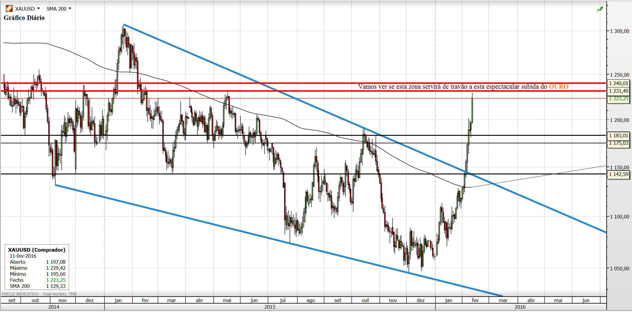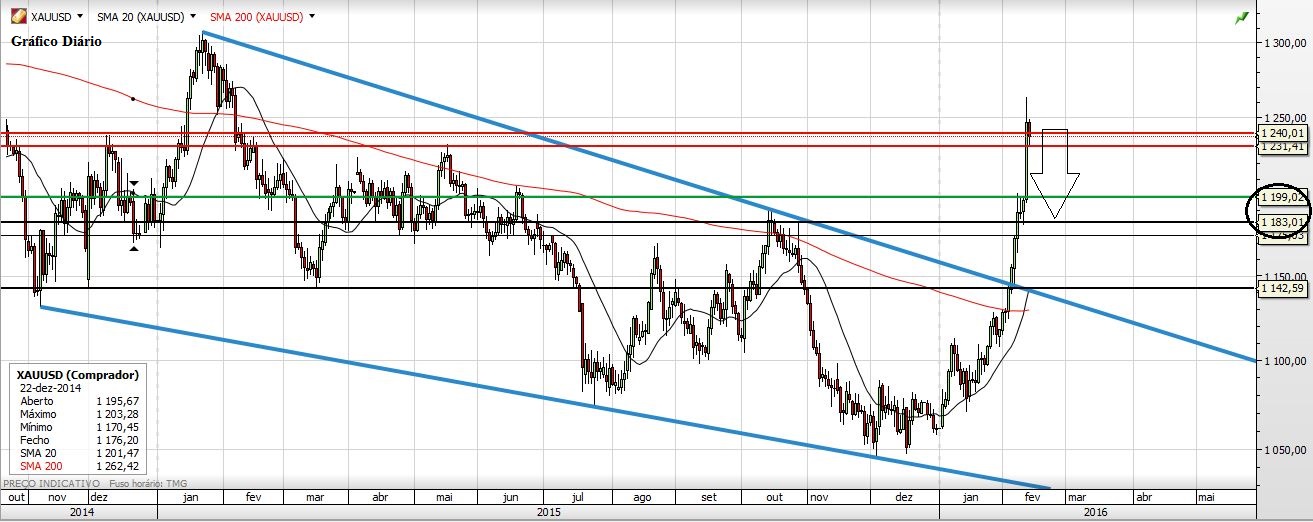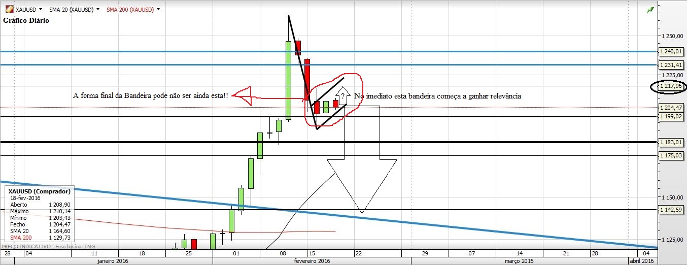 Deixo aqui a minha ideia para o Ouro. Para já descarto a hipótese de o Preço ir testar a M200 e/ou a Wedge, acho que o Ouro vai corrigir um pouco mas apenas até à zona dos 1200/1180 para depois retomar as subidas fortes.
