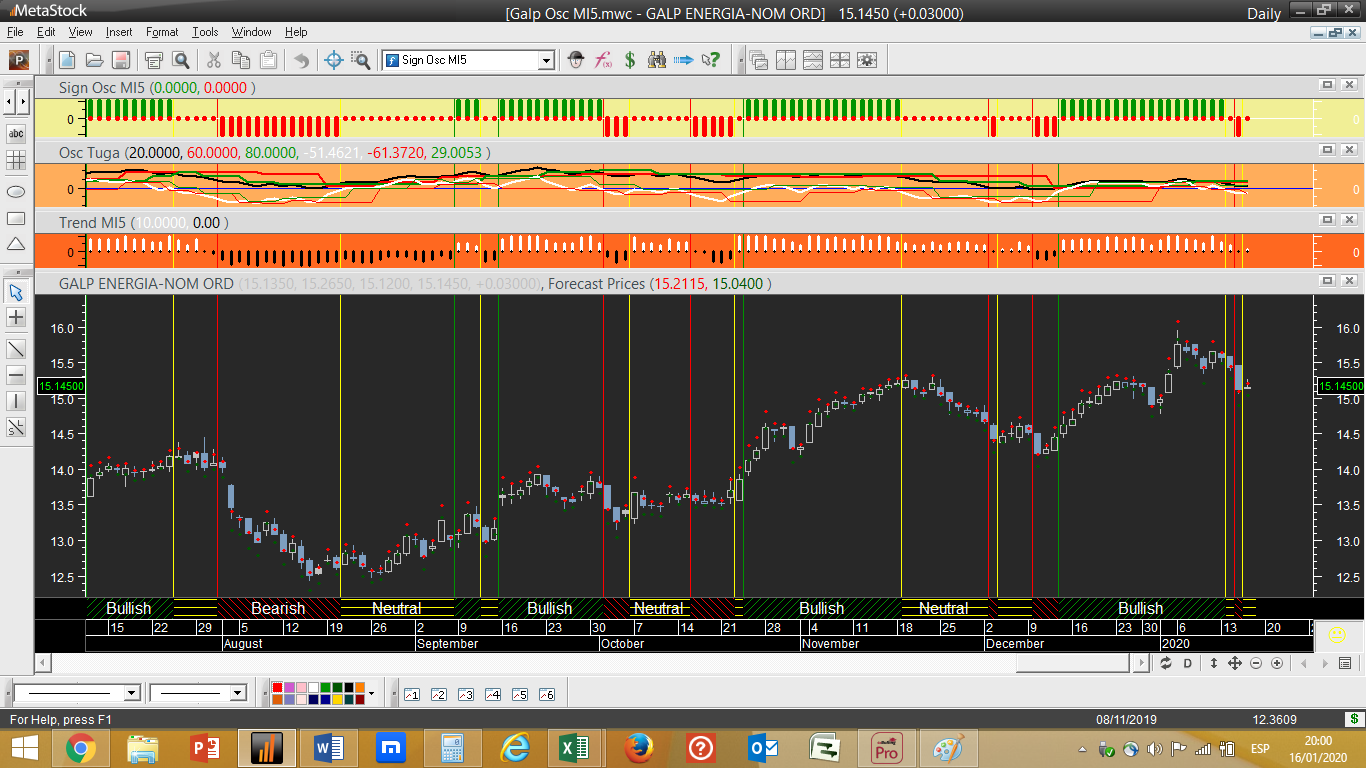 Galp – Passa de neutral a comprada. A ordem de ontem foi contrariada com a de hoje, ver 1º gráfico onde a tendência diária passa novamente a positiva embora por uma margem bastante pequena.