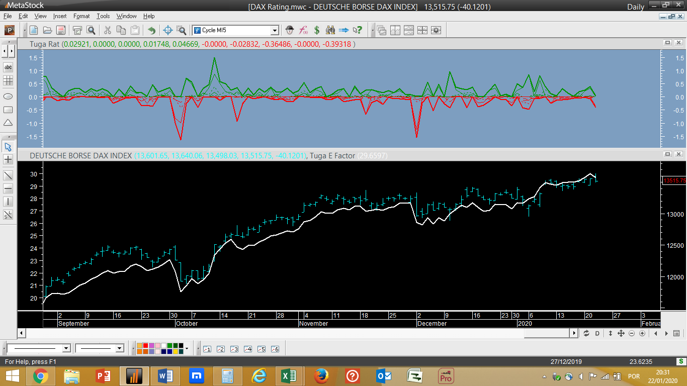 Para exemplificar melhor o que quero dizer atentem no 1º gráfico abaixo do DAX, que se foca num cálculo prévio dum indicador crítico que irá mais tarde integrar os valores finais do sistema “Osc MI5”, sendo o 2º gráfico o do sistema de trading do DAX no formato final habitual, que vai mantendo para já um sinal de compra.