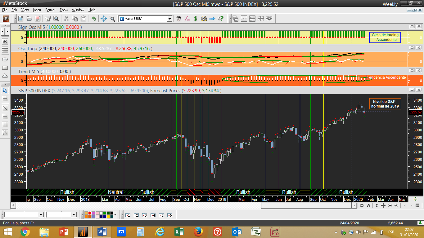 O gráfico do dia não podia deixar de se focar no principal índice mundial, o S&P-500, na sua escala semanal, que contrariamente ao que se poderia esperar ainda vai mantendo a sua posição comprada. Enquanto que as tendências nas escalas diária e semanal ainda se mantêm ascendentes, embora com valores deteriorados, o ciclo de trading semanal vai também continuando com um sentido ainda positivo, ao contrário do seu congénere diário. A semana que vai entrar será crítica para este mercado. Aguardemos!
