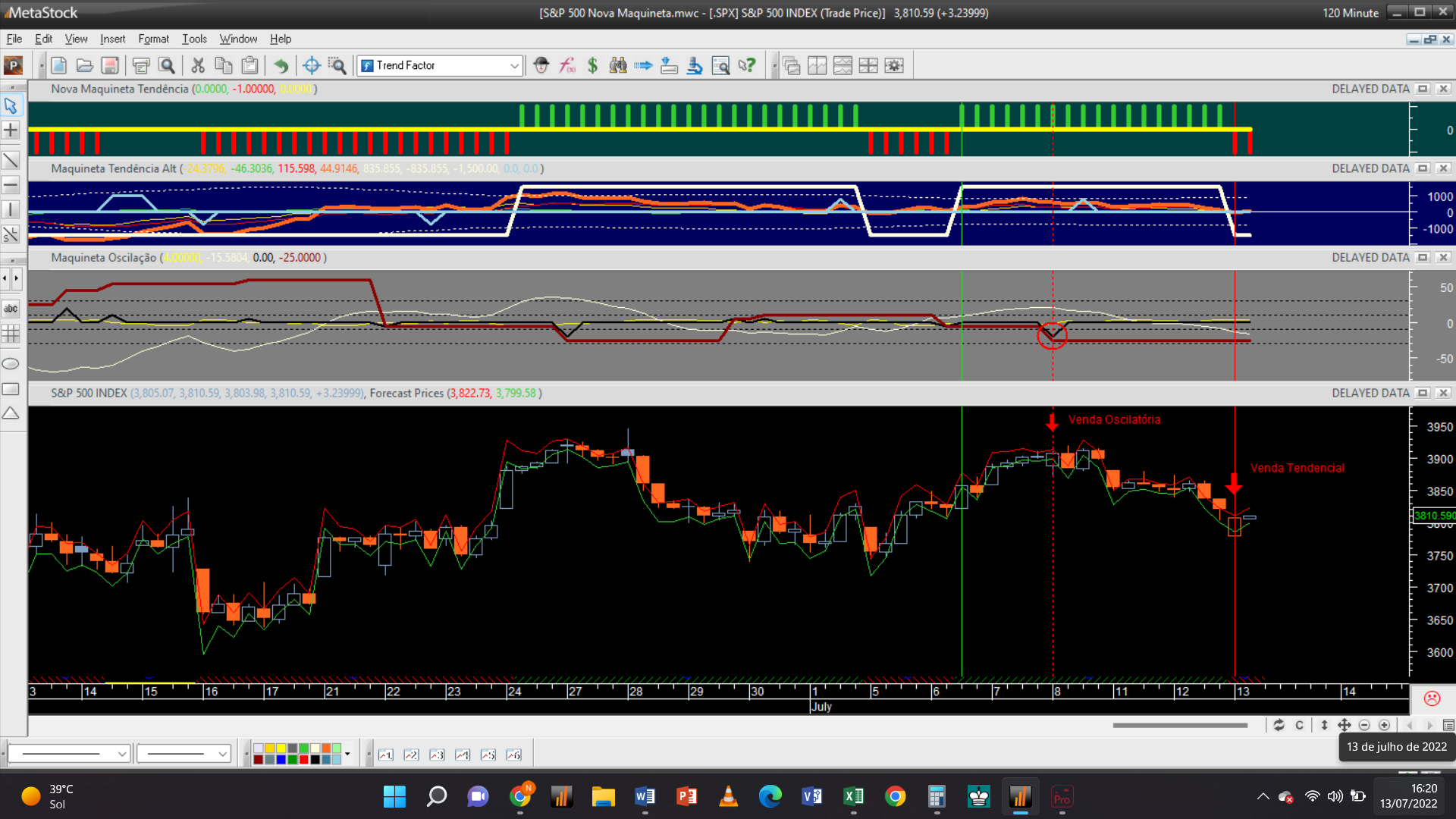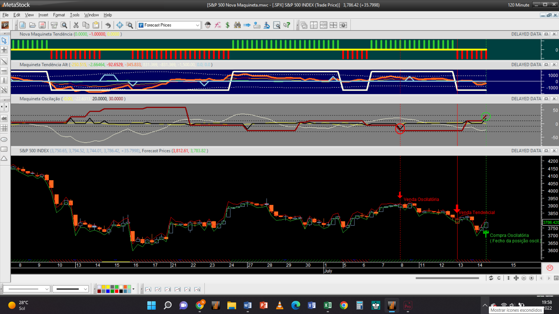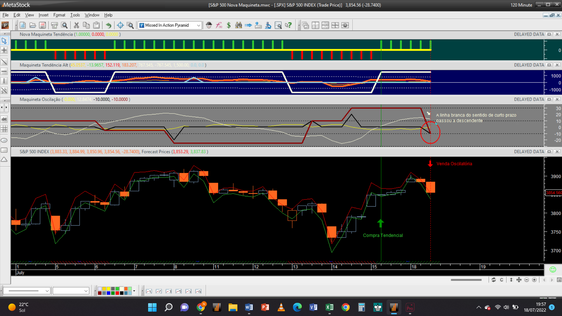 A abertura duma posição vendedora oscilatória na escala 2H aqui assinalada no passado dia 8 de julho ao preço de 3914 Usd/ contrato acabou de ser fechada hoje com uma operação de compra ao mercado com a mesma quantidade de contratos pelas 20 horas, ao preço unitário de 3789 Usd.