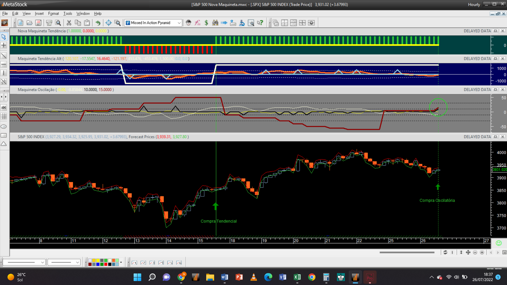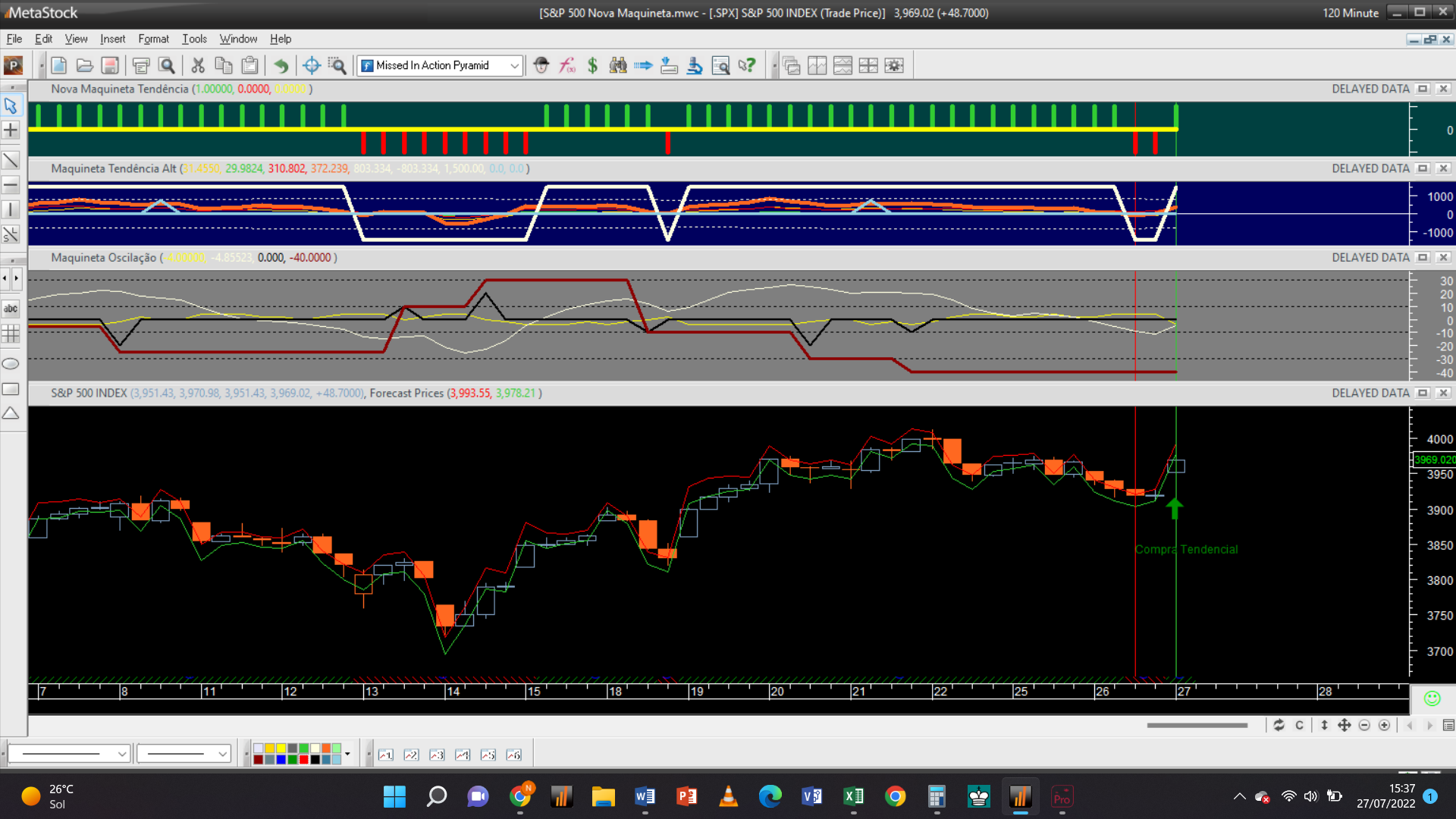 Até agora a única operação efetuada registou-se na escala 2H às 18 horas a preços do mercado, através duma compra ao preço de 3850 Usd / contrato, devida à inversão da tendência de negativa para positiva.