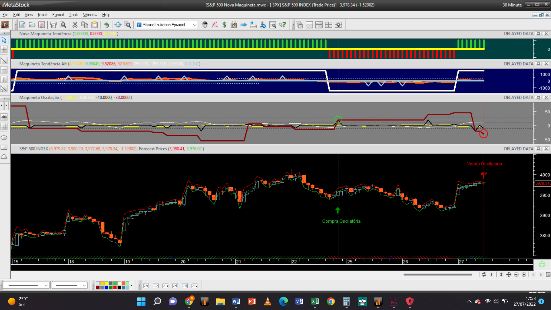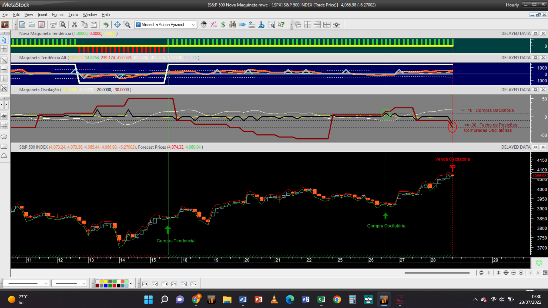A escala 30M, a mais baixa controlada pelo sistema de trading, acaba de disparar um sinal de compra oscilatória às 20h 35m ao preço limite de 3956 Usd / contrato.