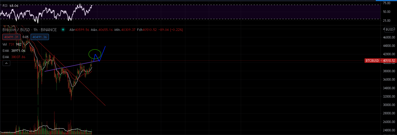 Escalada até resistência 42k; Re-teste da antiga resistência nos 40k para confirmação a ver se esta se torna no novo suporte, e aí sim, clear skies até aos 42k.
