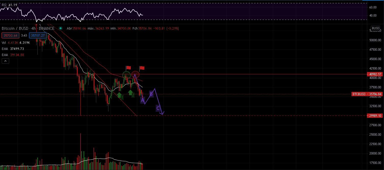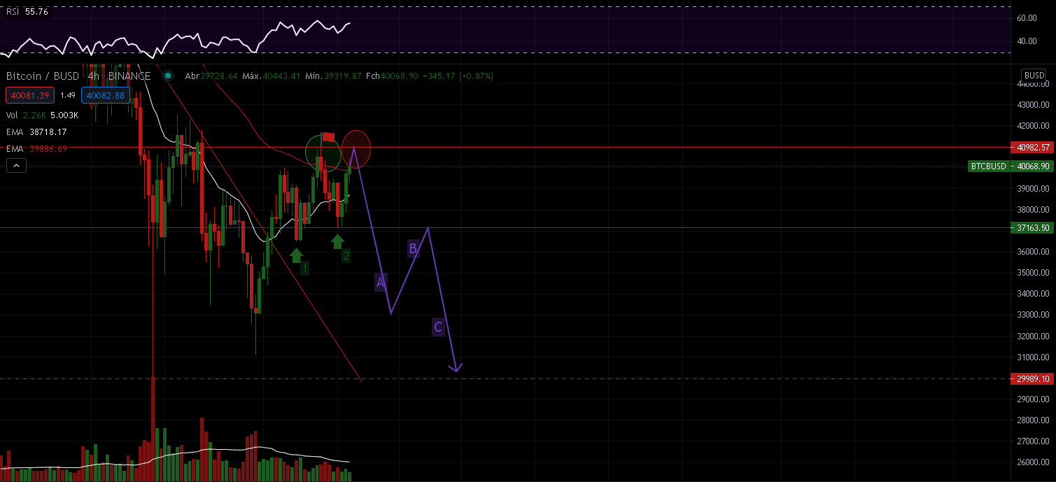 Se voltar a ser rejeitada (circulo vermelho), é bastante provável que apresente uma tendência bearish, e que tenha uma tendência de descida, mais ou menos igual à que desenhei na linha (A), até à zona 35.000/33.000.