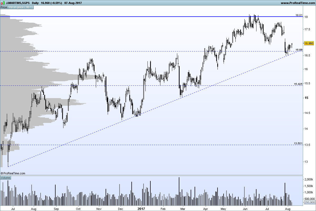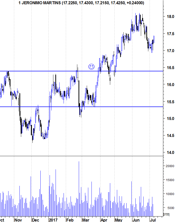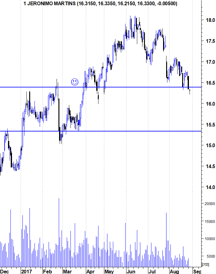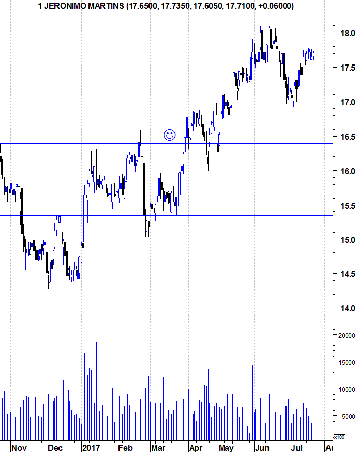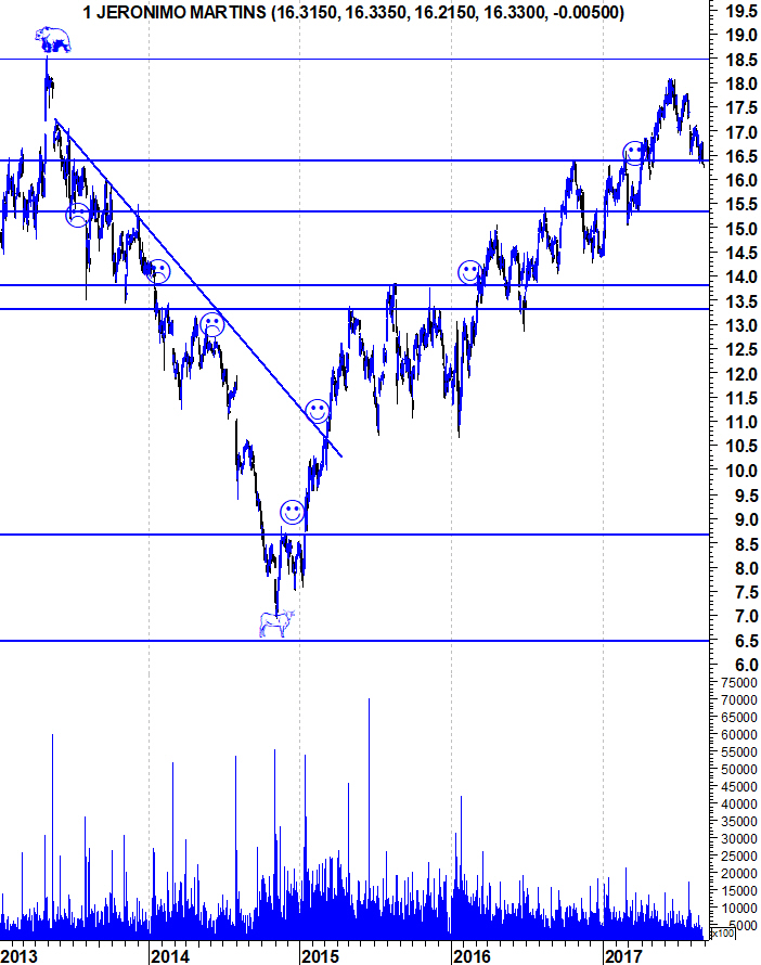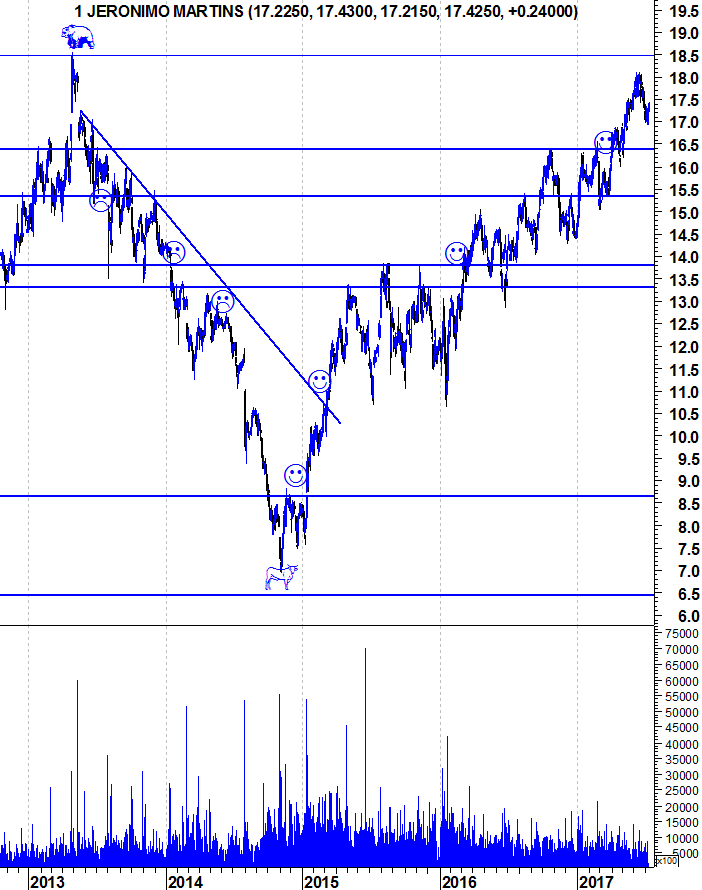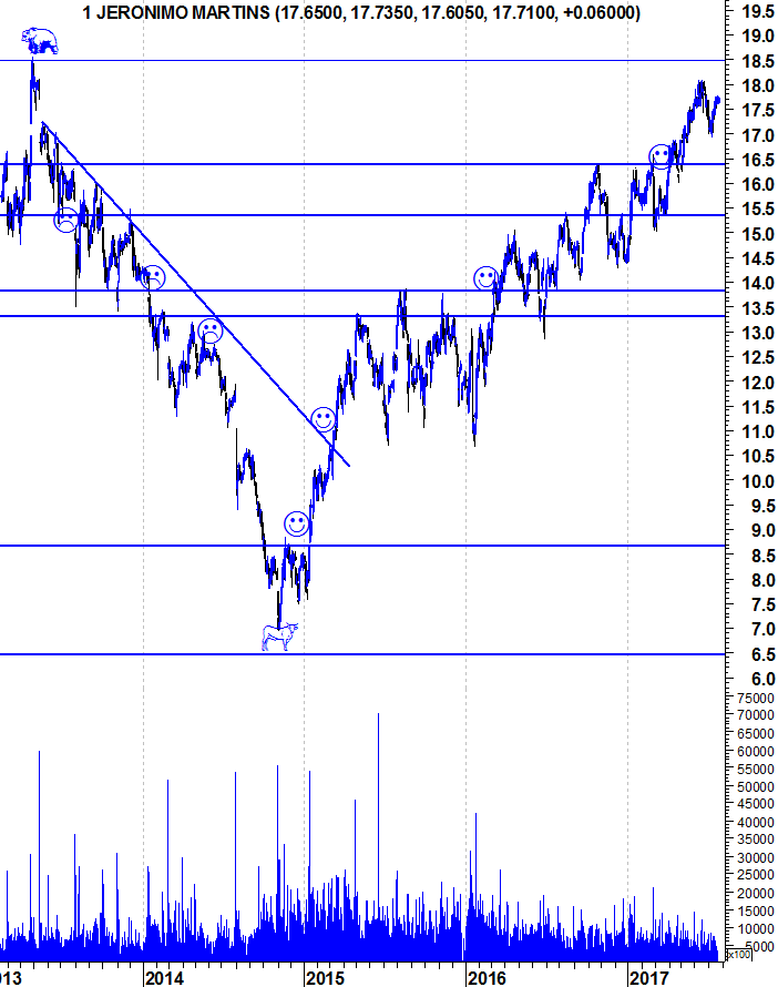 A AHOLD ( exposta aos USA ) e Carrefour têm já longas tendências descendentes nos gráficos e a JMT tem passado incólume pelo crescimento histórico, mas considero o valor neste momento potencialmente elevado. Está numa fase de crescimento já madura, apresentando ultimamente crescimento mínimo e com DY de cerca de 3%