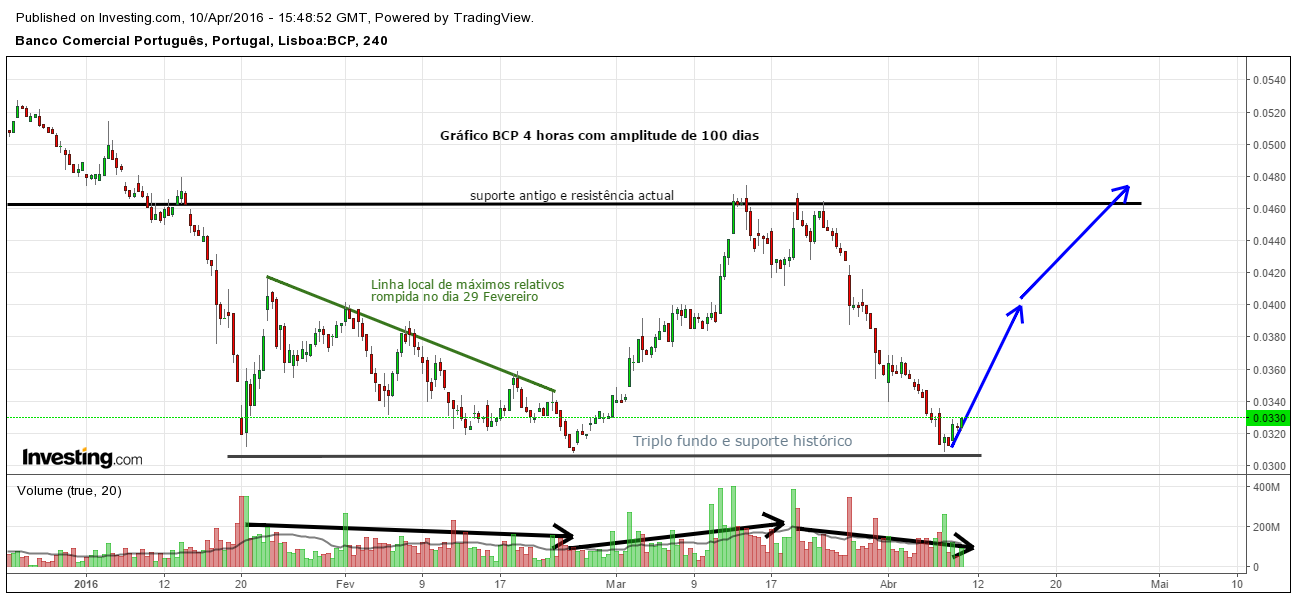 Admitamos, nem que seja por exercício académico ou por auto-consolação nestes tempos em que estamos quase todos a receber dos bancos extractos de menos valias, que a cotação atinge e quebra a linha dos 4,6 cêntimos (o que seria, para os longos, só por si, uma notícia excelente – recordo que o BCP teria de subir 40% para atingir esse número mítico. Abro um parêntesis de esperança fazendo notar que, segundo Bulkowski, os padrões abruptos de triplo fundo performam melhor do que bacias orográficas mais amplas.