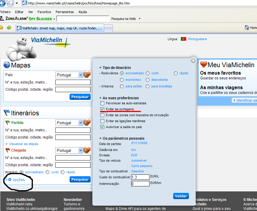 Em ambos os sites, há uma zona de opções onde podemos escolher, se queremos ou não evitar portagens.