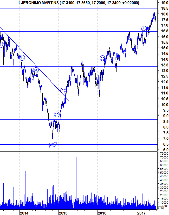Apesar de a JMT apresentar um Bull Market indiscutível no gráfico e estar ainda perto de máximos , acredito que é possível assistirmos a uma correção saudável daqui até Outubro , para a zona dos 16 euros , onde eu equacionaria fazer uma entrada , de acordo com condições do mercado.